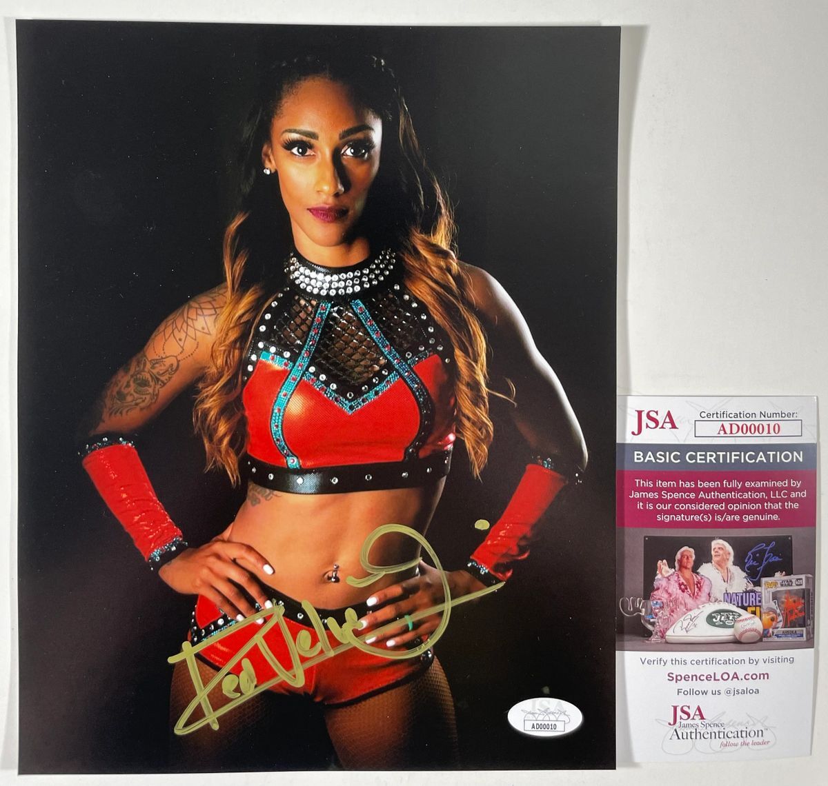 Professionally printed 8×10 photo, hand signed by member of The Baddies in All Elite Wrestling (AEW), the lovely Red Velvet. This is a clean, well placed signature that really pops off of this crisp, professionally printed 8×10 photo. Item has been authenticated by James Spence Authentications, and includes the JSA Certificate Of Authenticity card. JSA COA# AD00010
