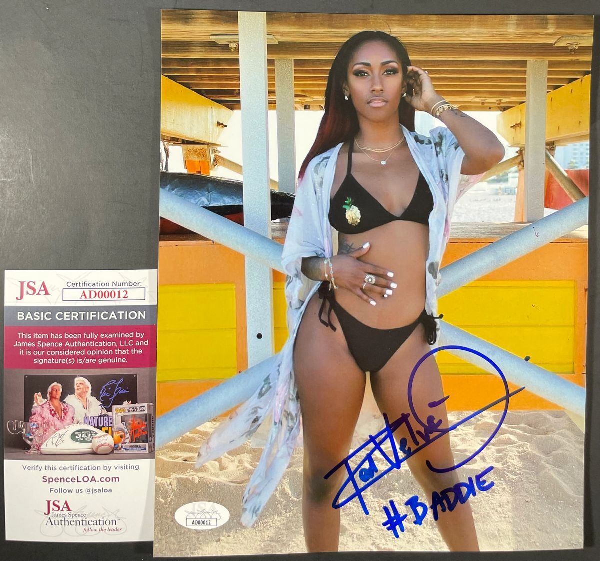 Professionally printed 8×10 photo, hand signed by member of The Baddies in All Elite Wrestling (AEW), the lovely Red Velvet. This is a clean, well placed signature, with “#Baddie” inscription that really pops off of this crisp, professionally printed 8×10 photo. Item has been authenticated by James Spence Authentications, and includes the JSA Certificate Of Authenticity card. JSA COA# AD00012