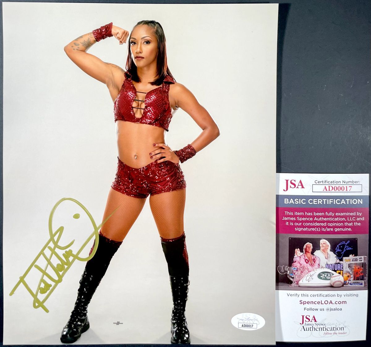 Professionally printed 8×10 photo, hand signed in person by member of The Baddies in All Elite Wrestling (AEW), the lovely Red Velvet. This is a clean, well placed signature, signed in a flowing Gold that really pops off of this crisp, professionally printed 8×10 photo. Item has been authenticated by James Spence Authentications, one of the most reputable third-party authentication companies in the world and includes the JSA Certificate Of Authenticity card.