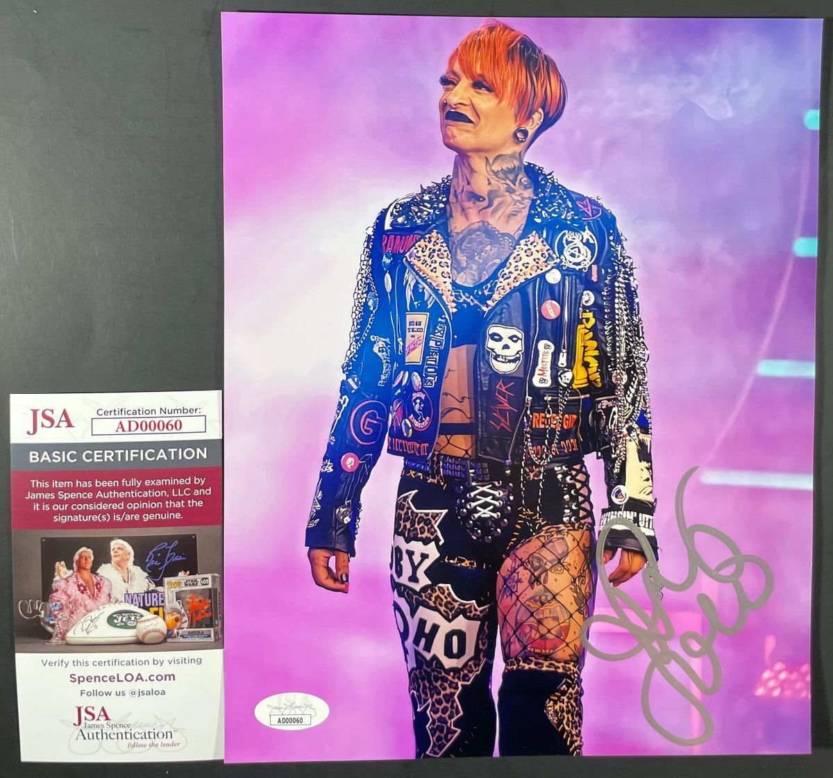 Professionally printed 8×10 photo, hand signed by All Elite Wrestling (AEW) women’s wrestler, Ruby Soho. Ruby formerly competed in the WWE and NXT as Ruby Riott, the leader of The Riott Squad. This is a clean, well placed signature that really pops off of this crisp, professionally printed 8×10 photo. Item has been authenticated by James Spence Authentications, and includes the JSA Certificate Of Authenticity card.