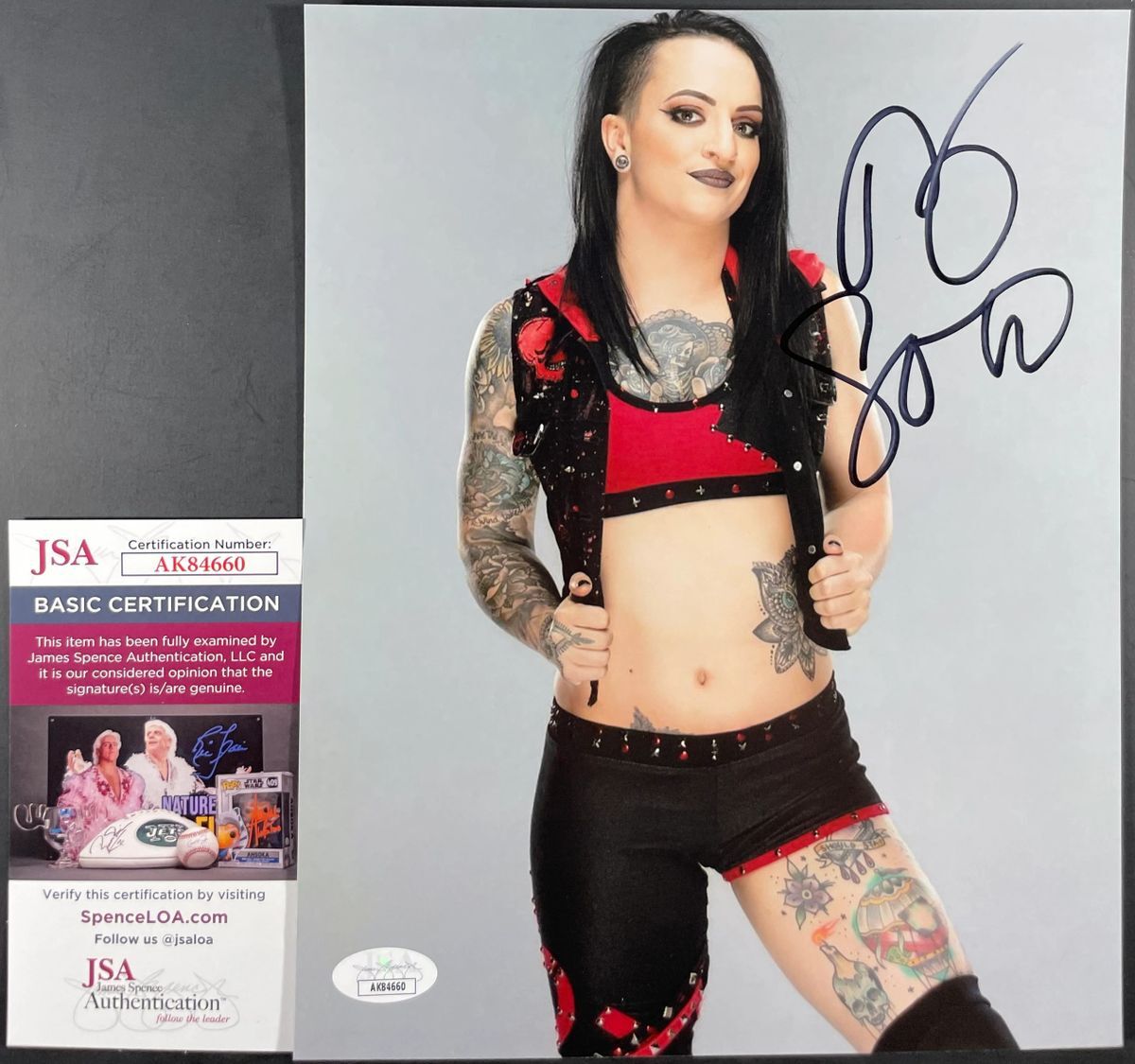 Professionally printed 8×10 photo, hand signed by All Elite Wrestling (AEW) women’s wrestler, Ruby Soho. Ruby formerly competed in the WWE and NXT as Ruby Riott, the leader of The Riott Squad. This is a clean, well placed signature that really pops off of this crisp, professionally printed 8×10 photo. Item has been authenticated by James Spence Authentications, and includes the JSA Certificate Of Authenticity card. JSA COA# AK84660