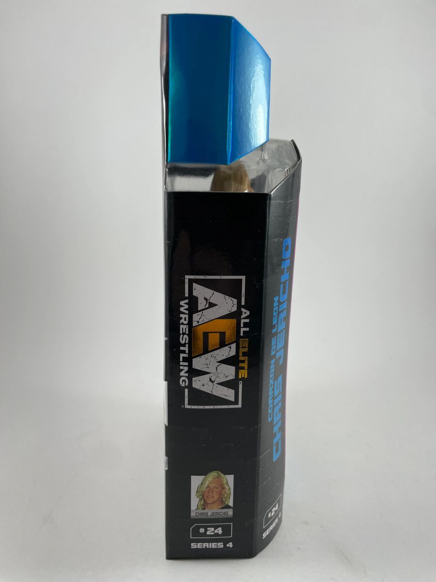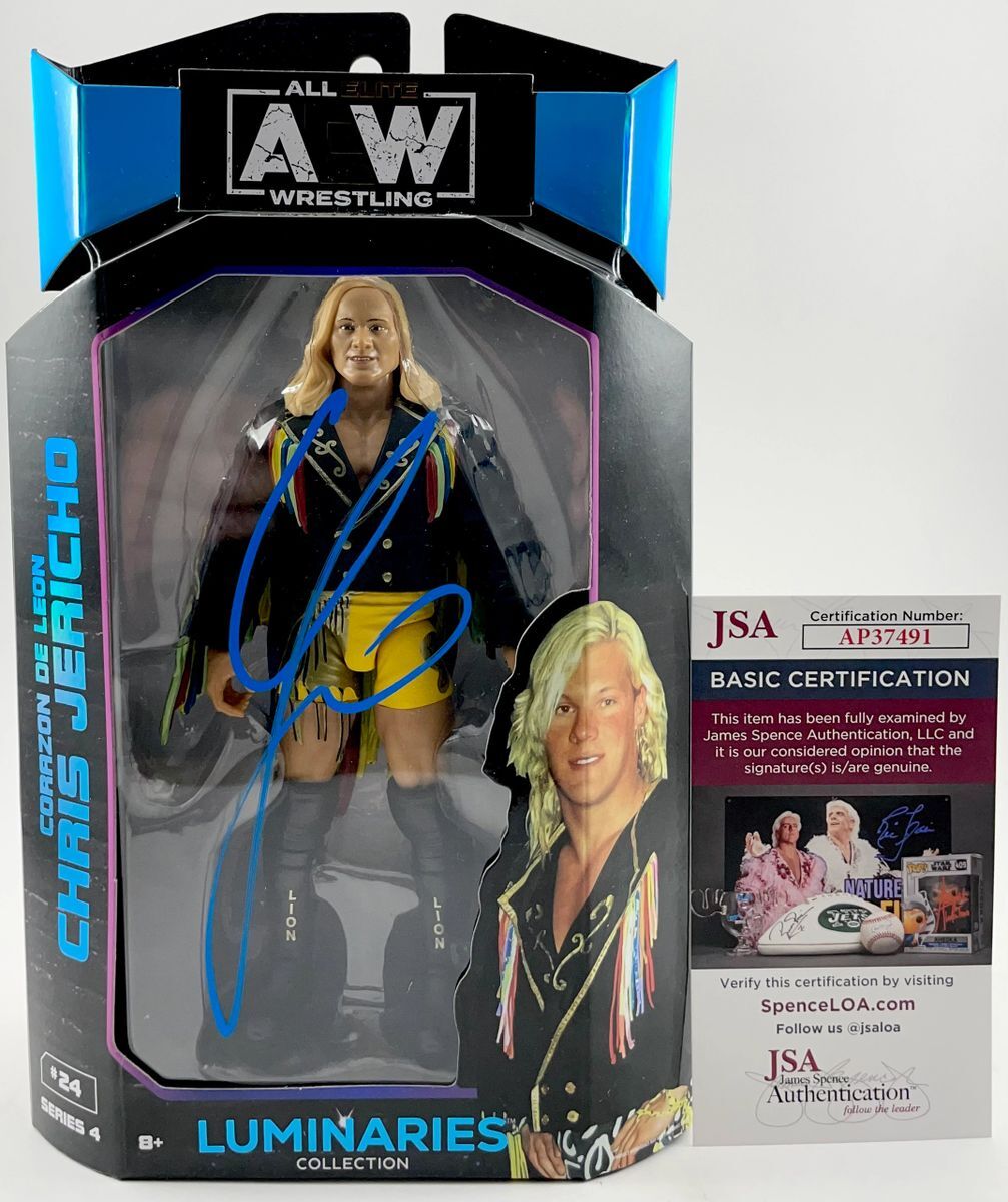 Chris Jericho Jazwares AEW Unmatched Series 4 Luminaries Figure, hand signed in person by the multi talented lead singer of Fozzy, and former WWE and All Elite Wrestling (AEW) World Champion, “The Ocho” Chris Jericho. This is a clean, well placed signature, signed in a flowing Blue 2 MM Decco paint pen that really pops off of the plastic. Item has been authenticated by James Spence Authentications, and includes the JSA Certificate of Authenticity card. JSA COA# AP37491