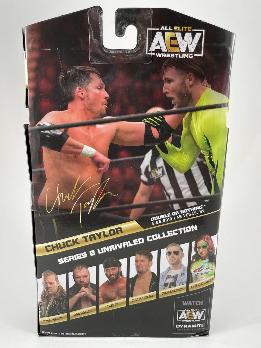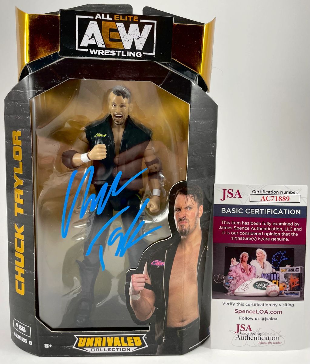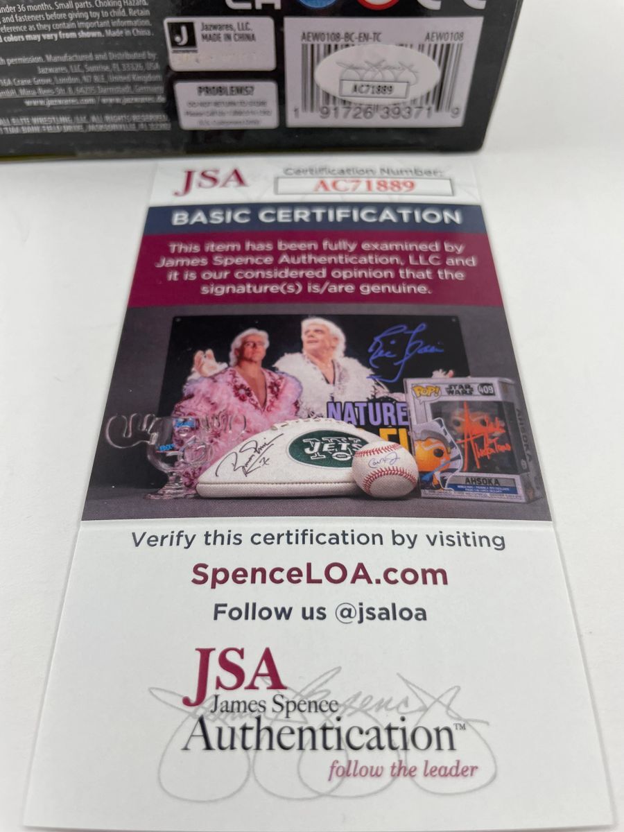 Chuck Taylor Jazwares AEW Unrivaled Series 8 Wrestling Figure, hand signed by Best Friends stable member in All Elite Wrestling (AEW), “The Kentucky Gentleman” Chucky Taylor AKA Chuckie T. This is a clean, well placed signature, signed in a flowing Blue 2 MM Decco paint pen that really pops off of the plastic. Item has been authenticated by James Spence Authentications, and includes the JSA Certificate of Authenticity card. JSA COA# AC71889