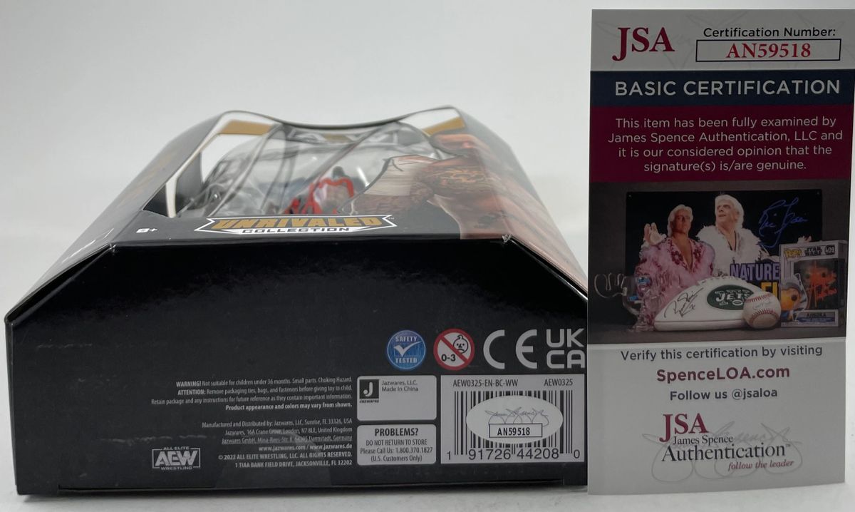 CM Punk Jazwares AEW Unrivaled Walmart Exclusive Wrestling Figure, hand signed in person by the controversial former AEW World Champion who recently returned home to the WWE, Chicago’s own CM Punk. This is a clean, well placed signature, signed in a flowing Red 2MM Molotow paint pen that really pops off of the plastic. Please be advised before purchasing that the figure bubble has suffered from heat warp and has basically shrunken in. The figure, rest of the box, and autograph are all fine. However the bubble covering the figure has been heat warped. Item has been authenticated by James Spence Authentications, and includes the JSA Certificate of Authenticity card.