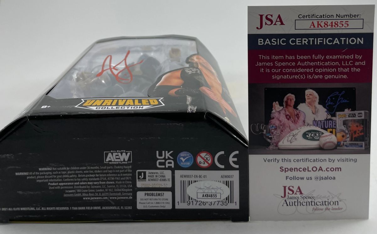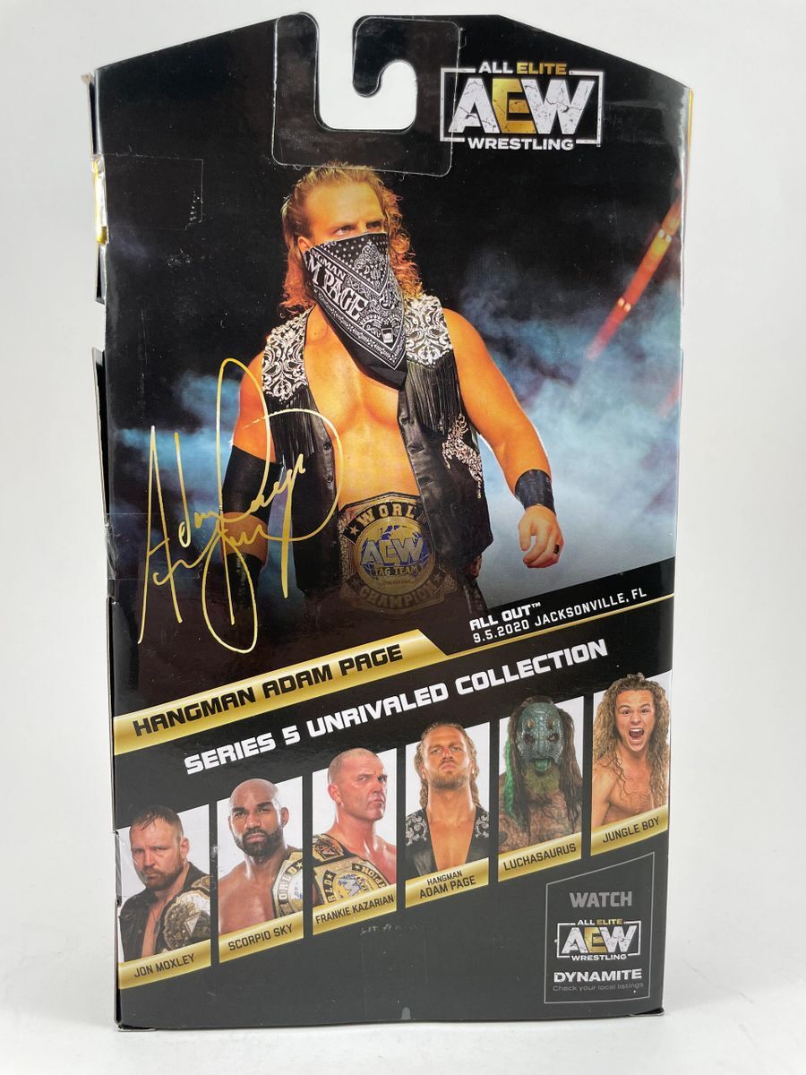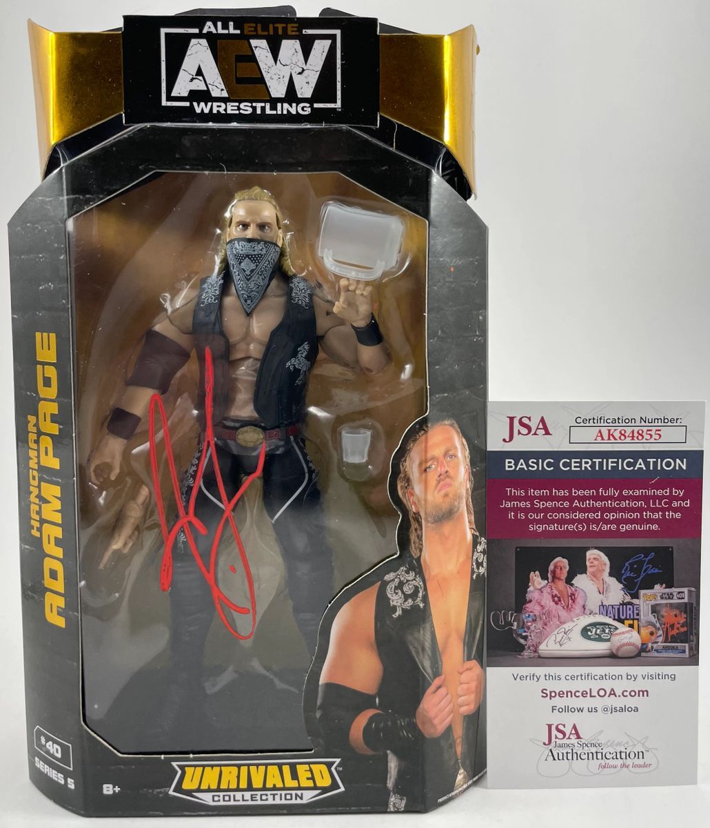 “Hangman” Adam Page Jazwares AEW Unrivaled Series 5 Wrestling Figure, hand signed in person by former All Elite Wrestling World Champion, Elite member, “Hangman” Adam Page. This is a clean, well placed signature, signed in a flowing Red 2 MM Molotow paint pen that really pops off of the plastic. Item has been authenticated by James Spence Authentications, and includes the JSA Certificate of Authenticity card. JSA COA# AK84855