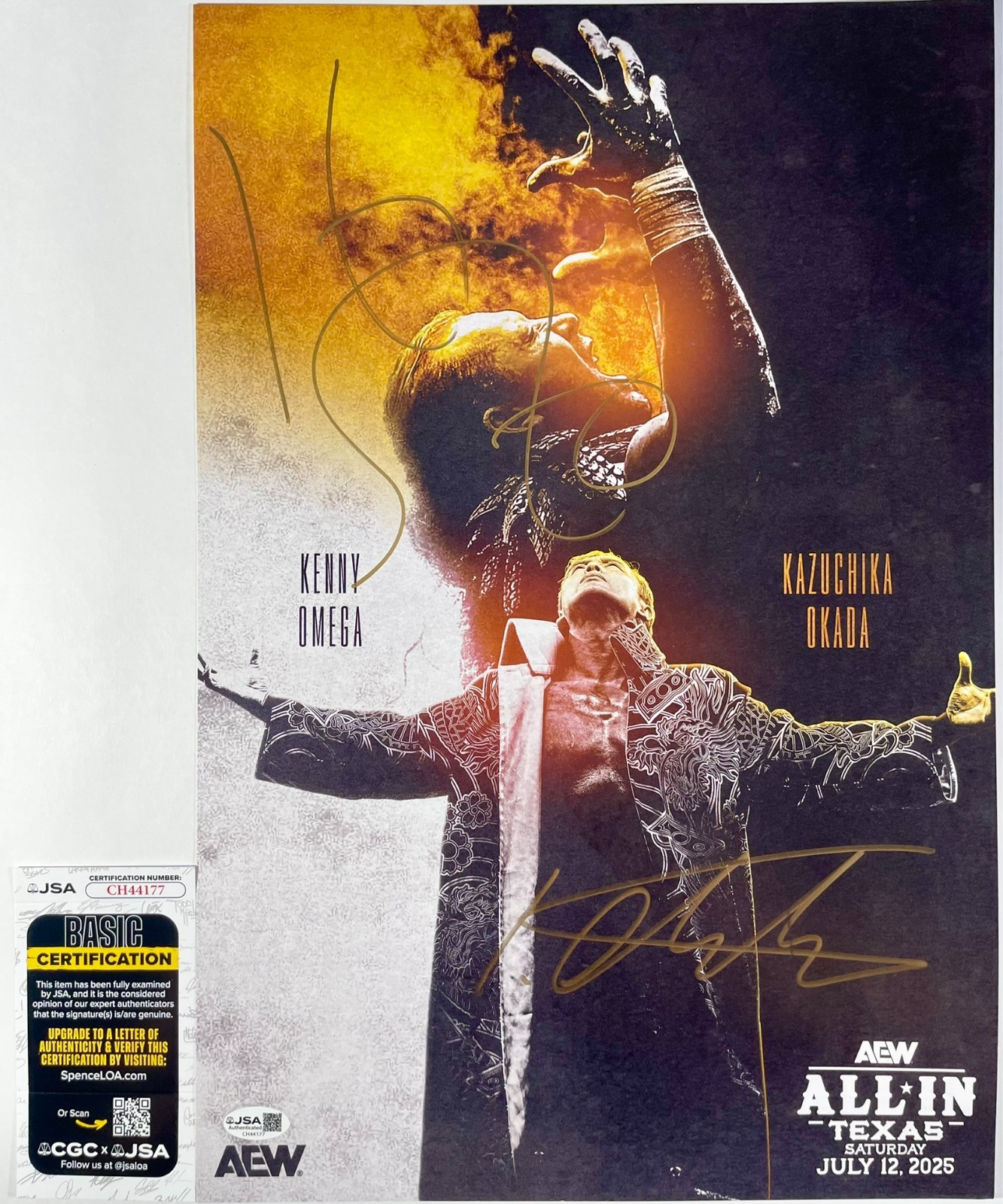 Official All Elite Wrestling (AEW) All In Texas 2025 Kenny Omega Vs Kazuchika Okada 12×18 Match Poster, hand signed in person by wrestling legends Kenny Omega and Kazuchika Okada. A very limited number of these posters were sold at the AEW All In Texas 2025 event. This is two clean, well placed signatures, signed in a matching flowing Gold Sharpie that really pops off of this officially licensed AEW All In Texas 2025 Kenny Omega VS Kazuchika Okada Match Poster. A clear plastic 12×18 toploader is included with purchase to safely ship the poster inside of. Not only does the poster have the All Elite Wrestling 100 Percent Authentic COA Hologram, but it has also been authenticated by James Spence Authentication, one of the most reputable third-party authentication companies in the world, and includes the JSA Certificate of Authenticity card.