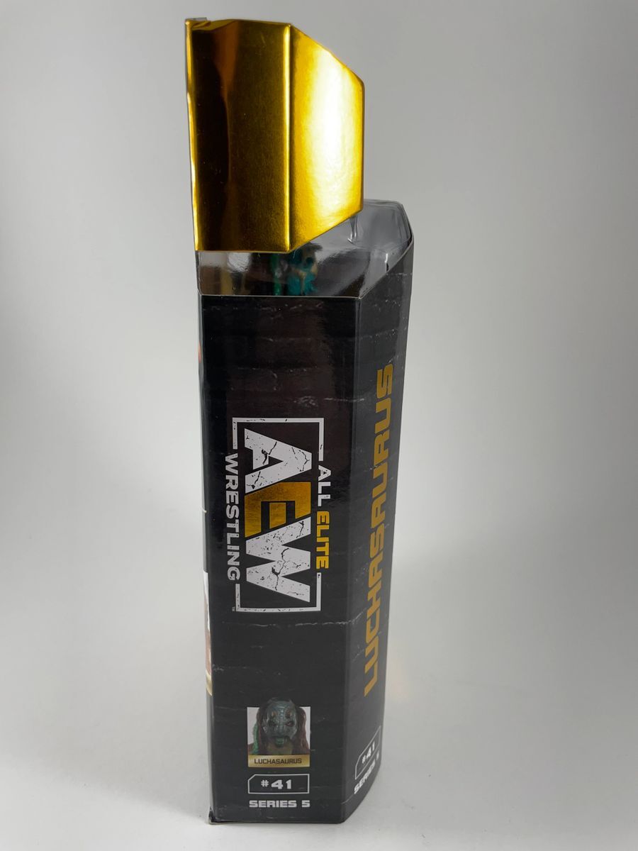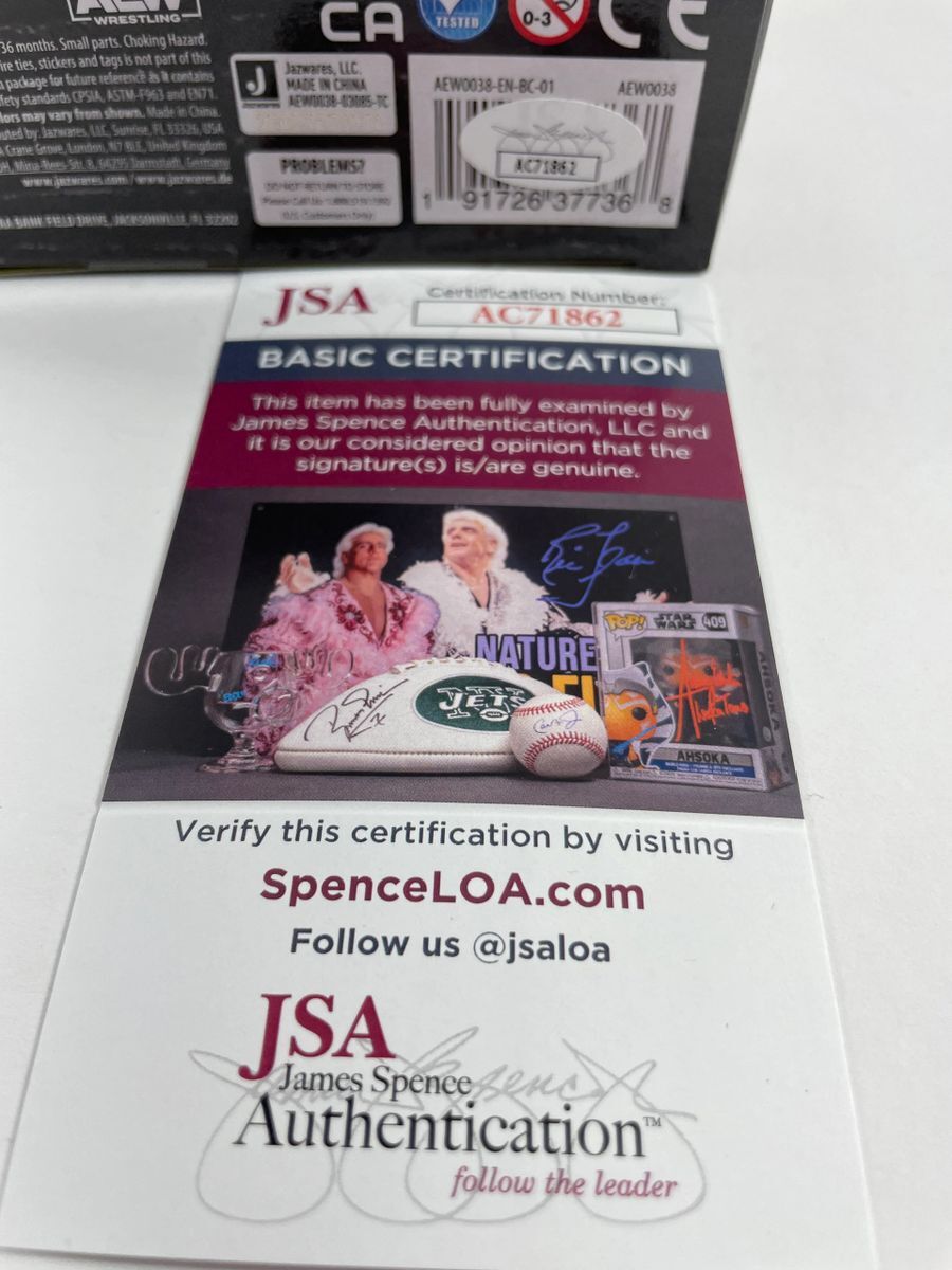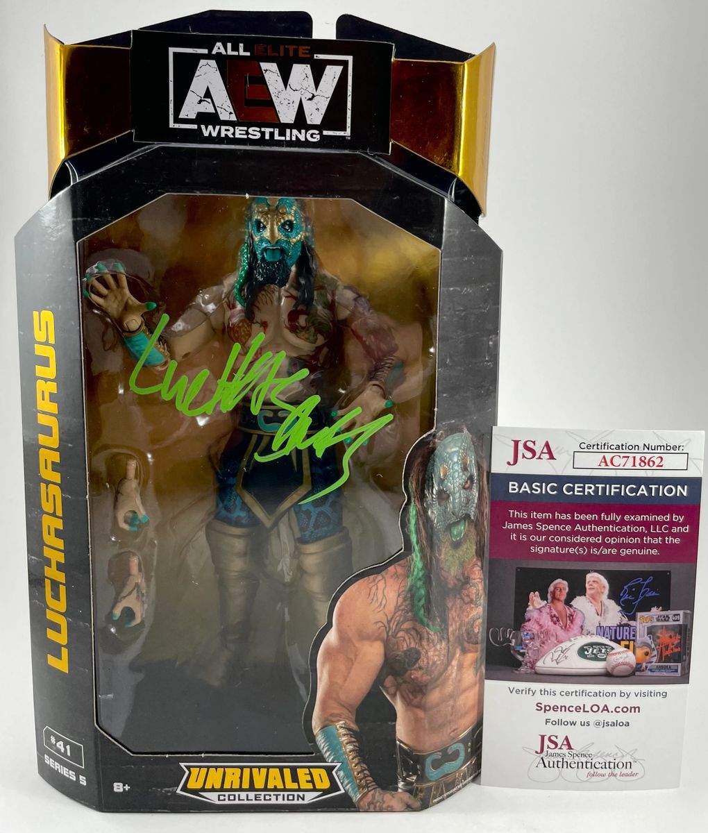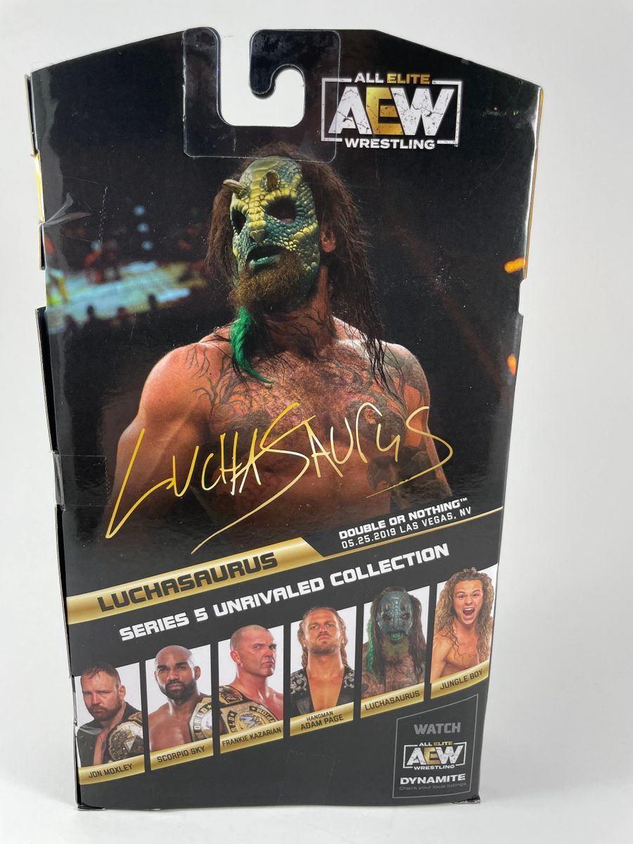 Luchasaurus Jazwares AEW Unrivaled Series 5 Wrestling Figure, hand signed by former All Elite Wrestling (AEW) Tag Team Champion, and one half of Jurassic Express, Luchasaurus. This is a clean, well placed signature, signed in a flowing Green 2 MM Decco paint pen that really pops off of the plastic. Item has been authenticated by James Spence Authentications, and includes the JSA Certificate of Authenticity card. JSA COA# AC71862