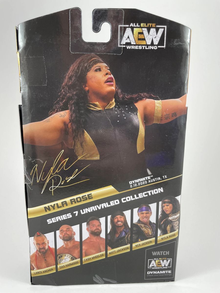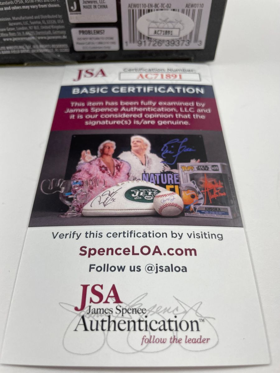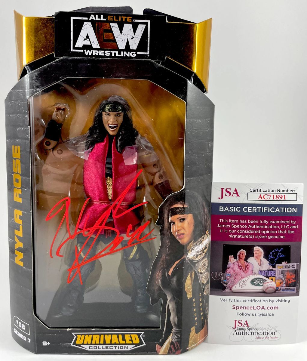 Nyla Rose Jazwares AEW Unrivaled Series 7 Wrestling Figure, hand signed by former All Elite Wrestling (AEW) Women’s Champion, Nyla Rose. This is a clean, well placed signature, signed in a flowing Red 2 MM Molotow paint pen that really pops off of the plastic. Item has been authenticated by James Spence Authentications, and includes the JSA Certificate of Authenticity card. JSA COA# AC71891