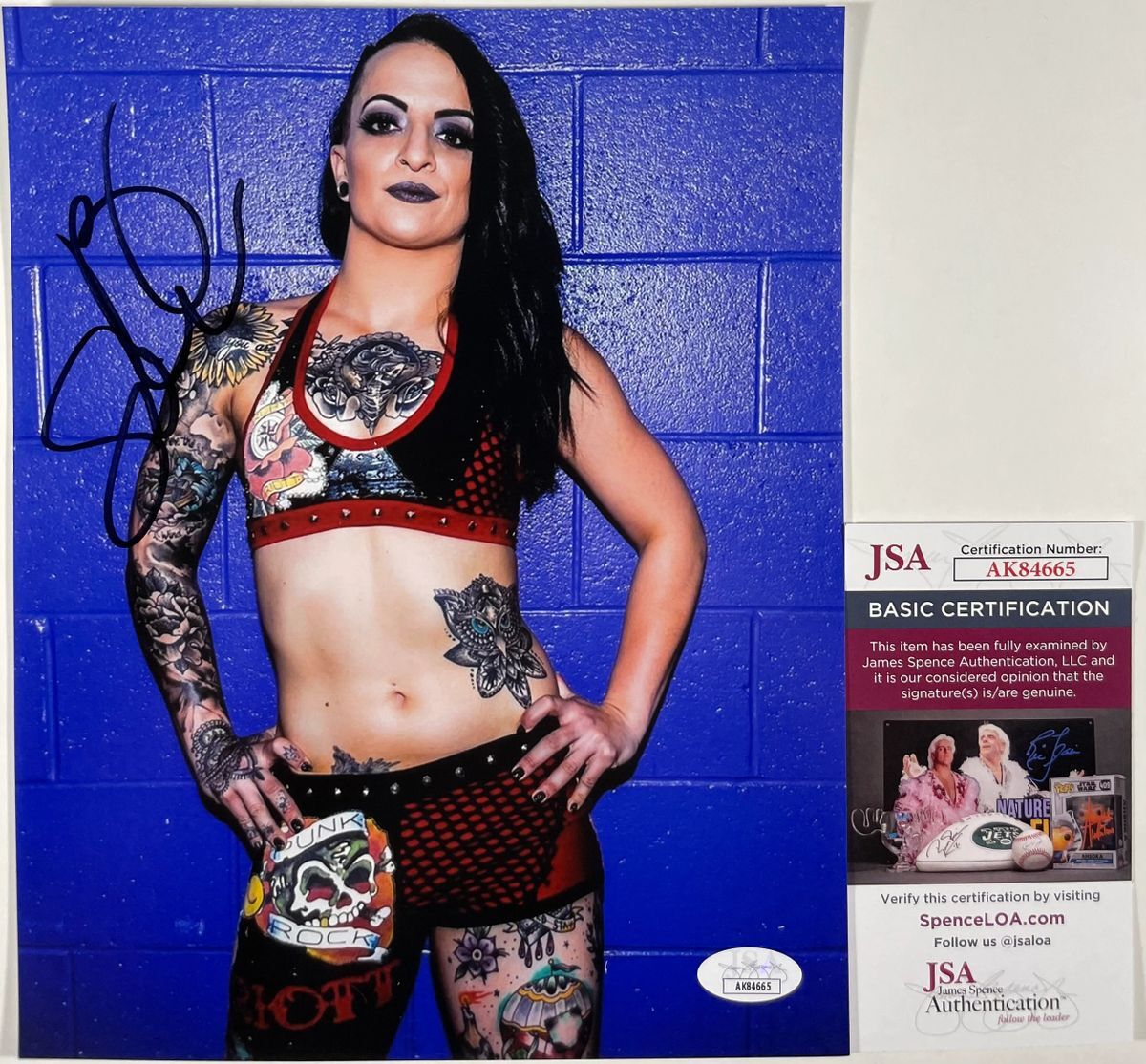 Professionally printed 8×10 photo, hand signed by one of The Outcasts in All Elite Wrestling (AEW), Ruby Soho. Before coming to AEW, Ruby wrestled in the WWE and NXT under the ring name Ruby Riott, leader of The Riott Squad. This is a clean, well placed signature that really pops off of this crisp, professionally printed 8×10 photo. Item has been authenticated by James Spence Authentications, and includes the JSA Certificate Of Authenticity card. JSA COA# AK84665
