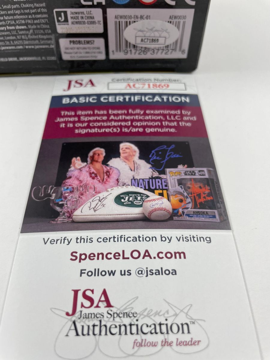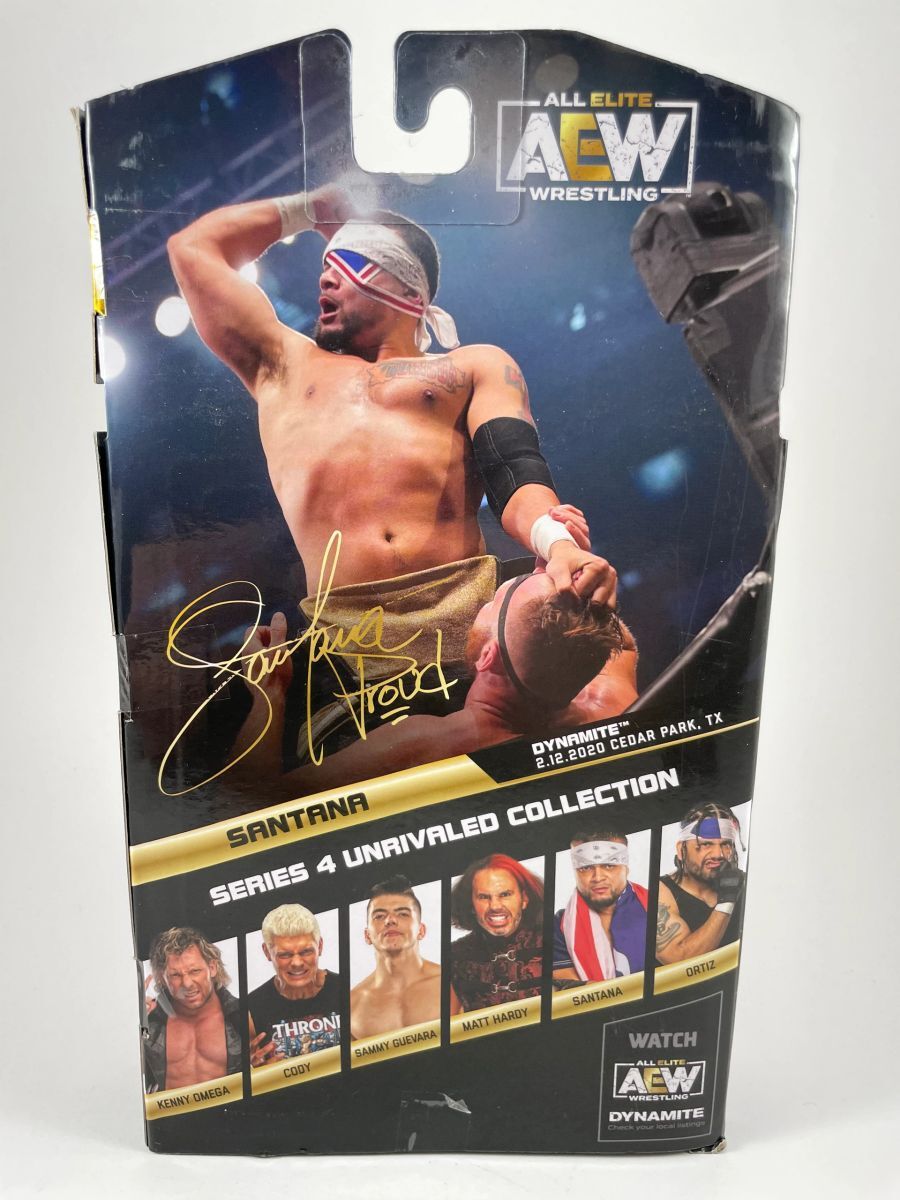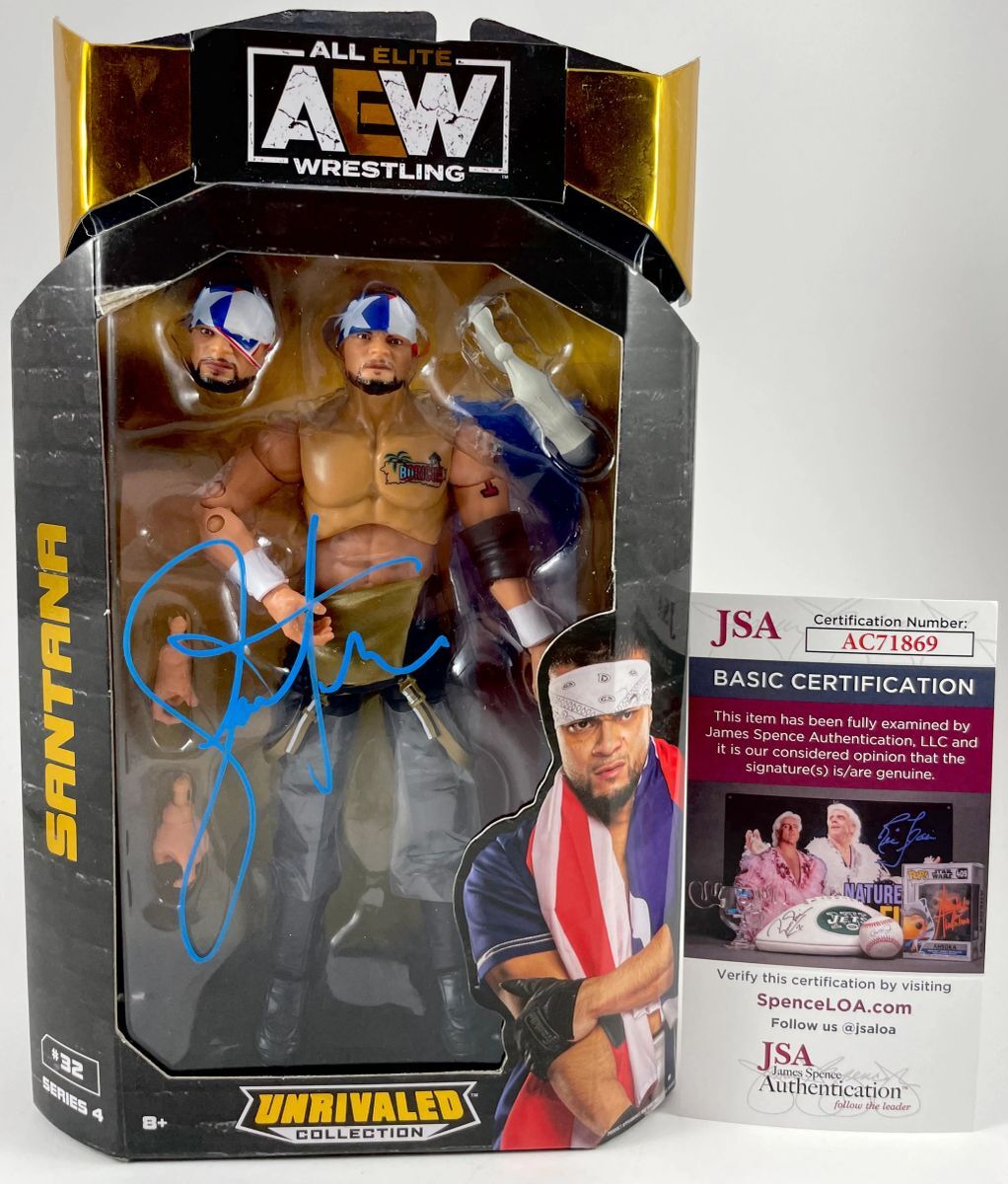 Santana Jazwares AEW Unrivaled Series 4 Wrestling Figure, hand signed by All Elite Wrestling (AEW) competitor Santana. This is a clean, well placed signature, signed in a flowing Blue 2 MM Decco paint pen that really pops off of the plastic. Item has been authenticated by James Spence Authentications, and includes the JSA Certificate of Authenticity card.