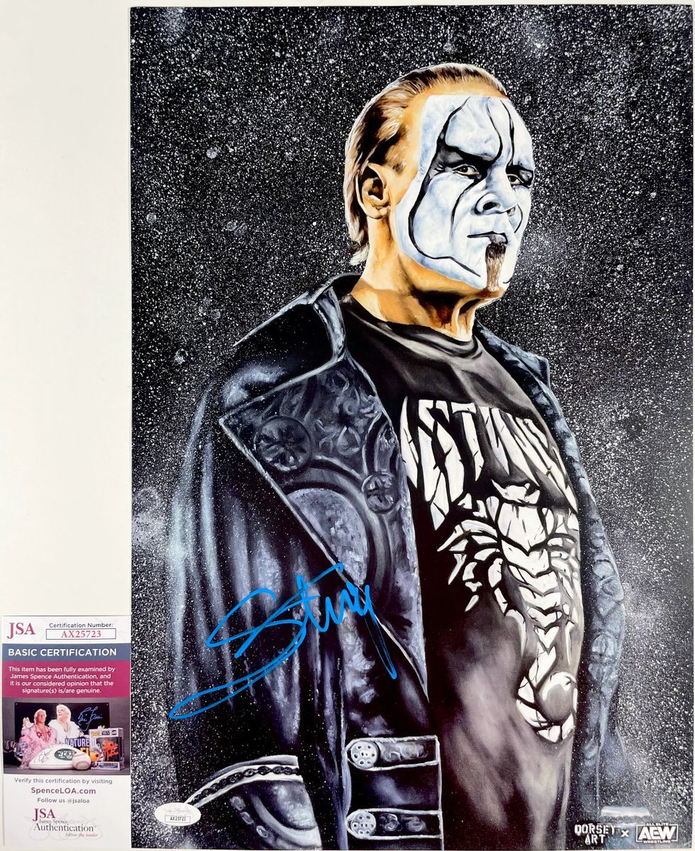 Officially licensed AEW Sting Dorsey Art 12×18 Poster Print, hand signed in person by WWE Hall Of Fame Superstar and six time WCW World Heavyweight Champion “The Icon” Sting. Steve Borden aka Sting also wrestled in TNA Impact Wrestling and retired from wrestling as a member of All Elite Wrestling (AEW). This is a clean, well placed signature, signed in a flowing Blue 2MM Decco Paint Pen that really pops off of this officially licensed AEW Dorsey Art 12×18 Poster Print of Sting. I purchased this Dorsey Art 12×18 Poster Print from the Fan Fest at AEW’s annual Double or Nothing event in Las Vegas a couple of years back, and at a later date personally had Sting sign the poster. Item has been authenticated by James Spence Authentications, one of the most reputable third-party authentication companies in the world and includes the JSA Certificate Of Authenticity card.