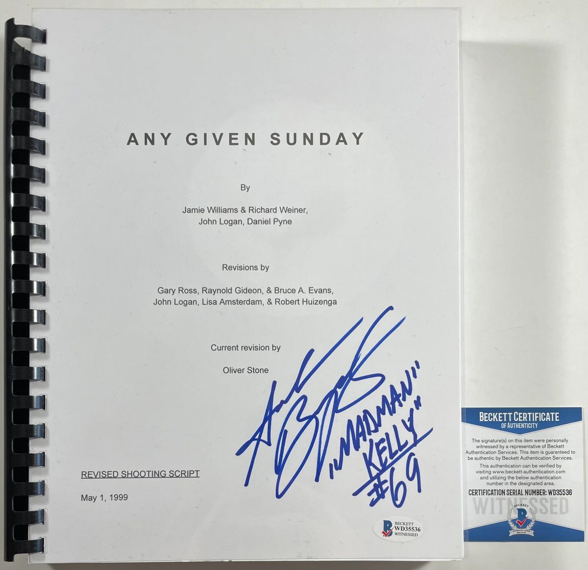 Professionally bound Any Given Sunday complete movie script, hand signed in person by actor Andrew Bryniarski who played the role of Patrick “Madman” Kelly in the 1999 film Any Given Sunday. This is a clean, well placed signature, with character name “Madman Kelly #69” inscription, signed in a flowing Blue Sharpie that really pops off of the cover of this Any Given Sunday full movie script. Script is complete, professionally bound and comes with a clear plastic protector. Clear on the front so you can display the script, and black on the back. Item was witnessed being signed by Beckett Authentication Services, one of the most reputable third party authentication companies in the world. The Beckett Witness Certificate Of Authenticity card is included.
