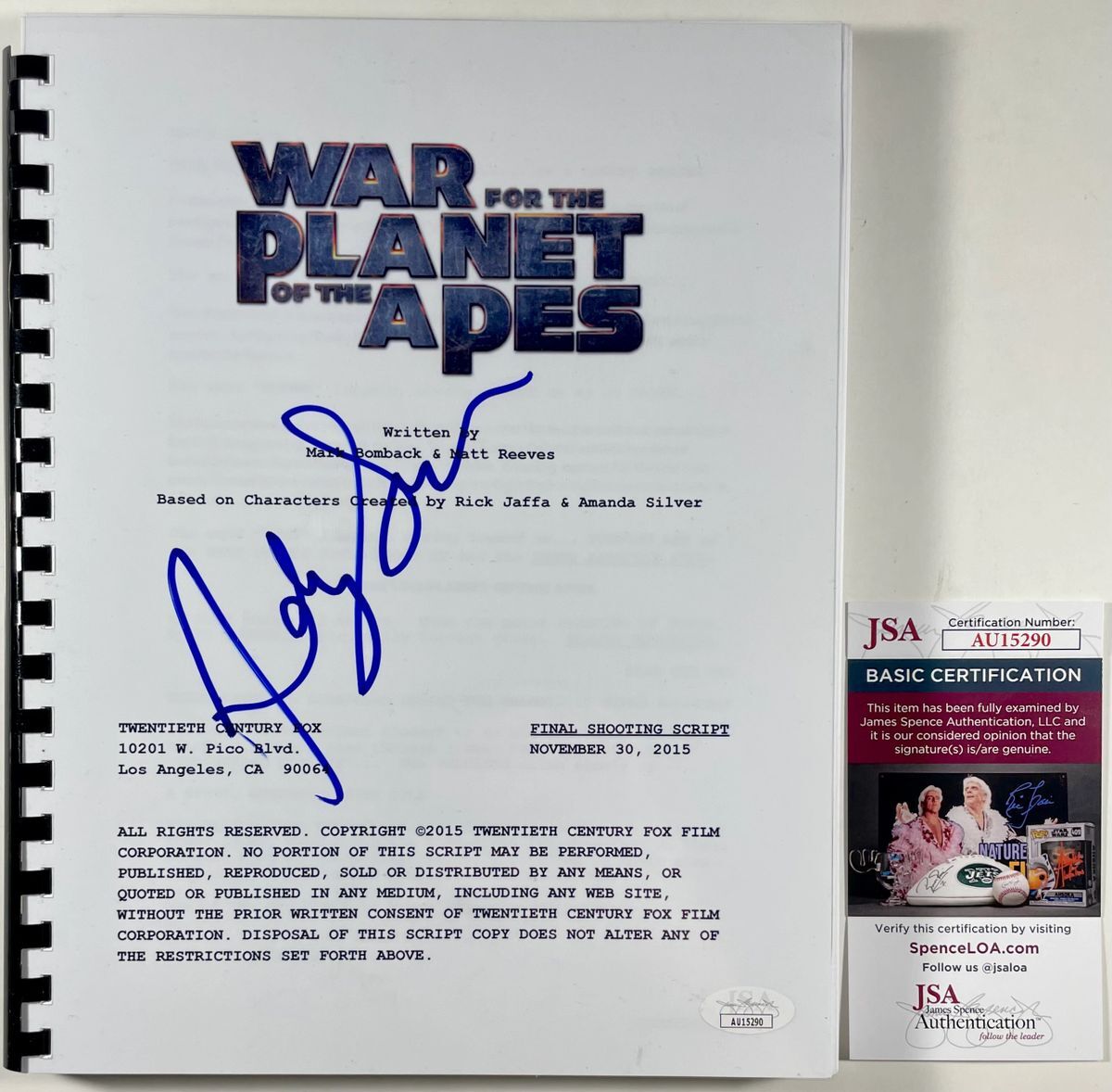Professionally bound, War For The Planet Of The Apes Complete Movie Script, hand signed in person by actor Andy Serkis who starred in the Planet Of The Apes films as Caesar. This is a clean, well placed signature, signed in a flowing Blue Sharpie that really pops off of the cover of this War For The Planet Of The Apes full Movie Script. Script is complete, professionally bound, and comes with a clear plastic protector. Clear on the front so you can display the script, and black on the back. Item has been authenticated by James Spence Authentications, one of the most reputable third party authentication companies in the world, and includes the JSA Certificate Of Authenticity card.