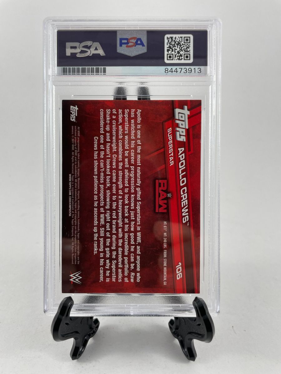 Apollo Crews 2017 Topps WWE Then Now Forever Trading Card #106, hand signed in person by WWE NXT Superstar Apollo Crews. This is a clean, well placed on card signature, that really pops off of this 2017 Topps WWE Then Now Forever Trading Card. Stand is for display purposes only and is not included. Item has been authenticated and slabbed / encapsulated by PSA/DNA. PSA/DNA COA# 84473913