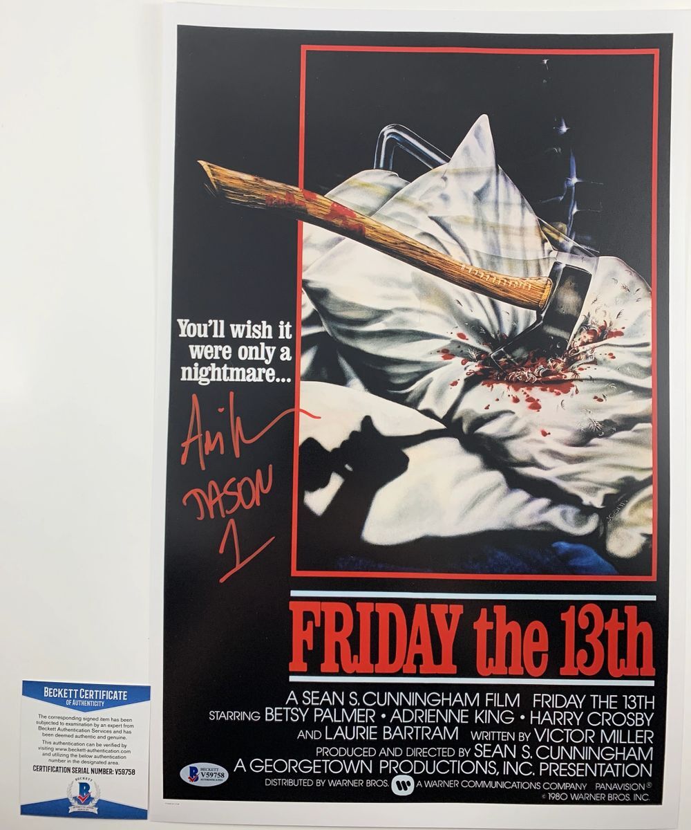 Professionally printed Friday The 13th 11×17 movie poster, hand signed by actor Ari Lehman who played the role of Jason Voorhees, The Boy In The Lake in the original Friday The 13th film. This is a clean, well placed signature, with “Jason 1” inscription on this crisp, professionally printed 11×17 movie poster. Item has been authenticated by Beckett, the leader in authenticating services, and includes the Beckett Certificate of Authenticity card. BAS COA# V59758