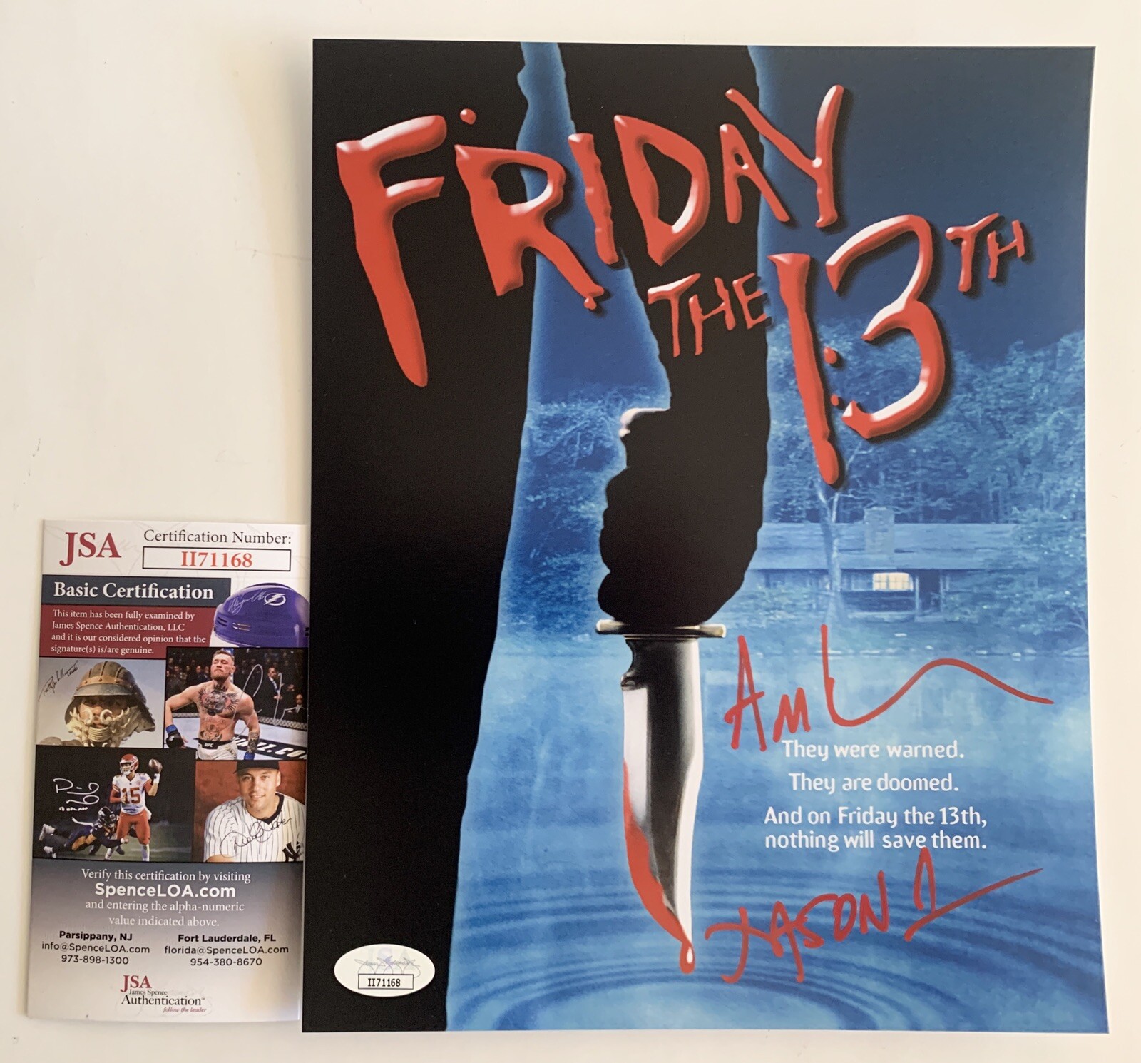 This listing is for an autographed Friday The 13th Alternate Movie Poster 8×10 photo, hand signed by Ari Lehman who played the original Boy In The Lake in the original Friday the 13th 1980. This is an absolutely gorgeous piece, for a serious collector who takes some pride in their collection. This is a clean, well placed signature with Jason 1 inscription on this crisp 8×10 photo. A definite must own piece for any serious collector or fan. Item was authenticated by JSA, and comes with a matching JSA Certificate Of Authenticity card.