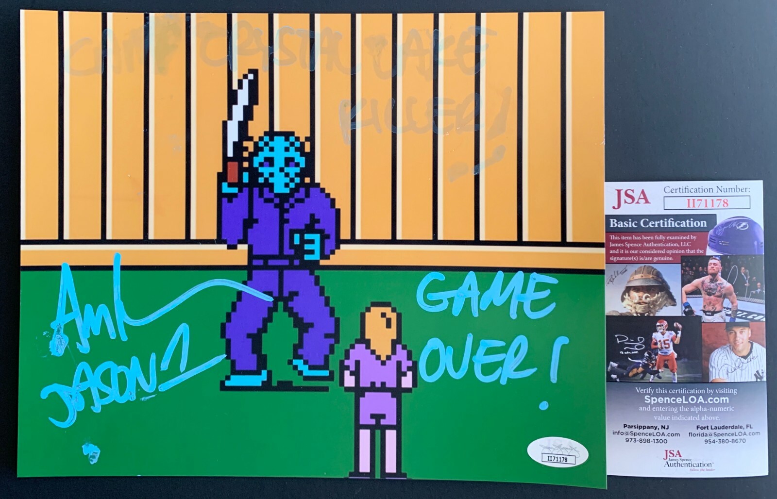 This listing is for an autographed 8×10 Jason Voorhees photo, signed by actor Ari Lehman who played Jason, The Boy In The Lake in the original classic Friday The 13th 1980. This is an absolutely gorgeous piece, for a serious collector who takes some pride in their collection. This is a clean, well placed signature and multiple inscriptions on this unique image from the original NES game Friday The 13th. Ari was kind enough to add Jason 1, Crystal Lake Killer, and Game Over inscriptions. A definite must own piece for any serious collector or fan. Item was authenticated by JSA, and comes with a matching JSA Certificate Of Authenticity card.
