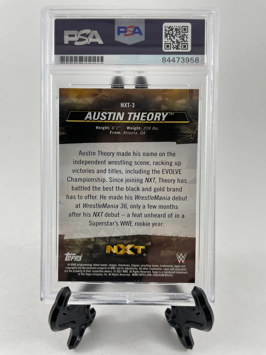Austin Theory 2021 Topps WWE We Are NXT Insert Trading Card #NXT-3, hand signed in person by WWE Superstar Austin Theory. This is a clean, well placed on card signature, that really pops off of this 2021 Topps WWE We Are NXT Insert Trading Card. Stand is for display purposes only and is not included. Item has been authenticated and slabbed / encapsulated by PSA/DNA. PSA/DNA COA# 84473958
