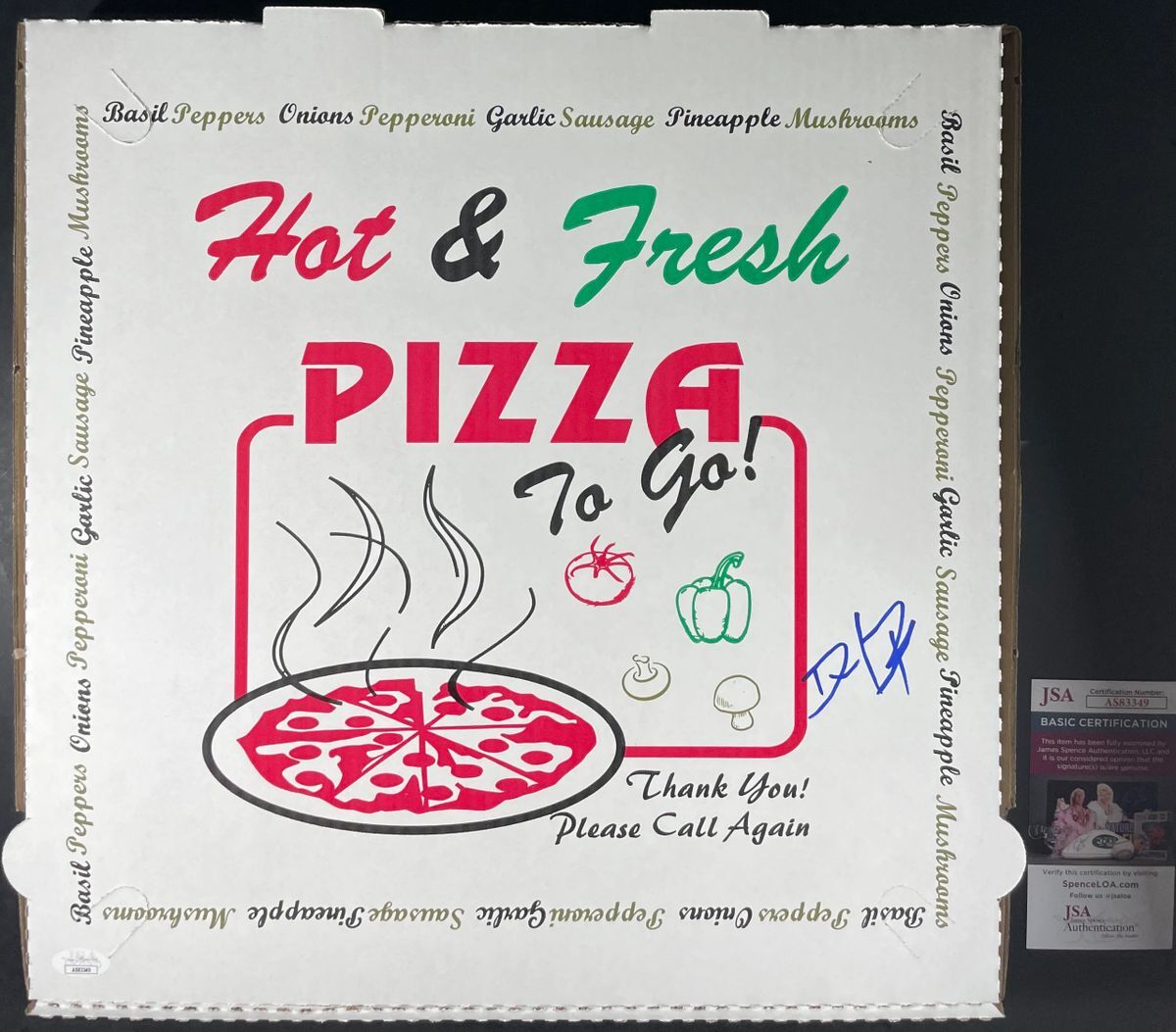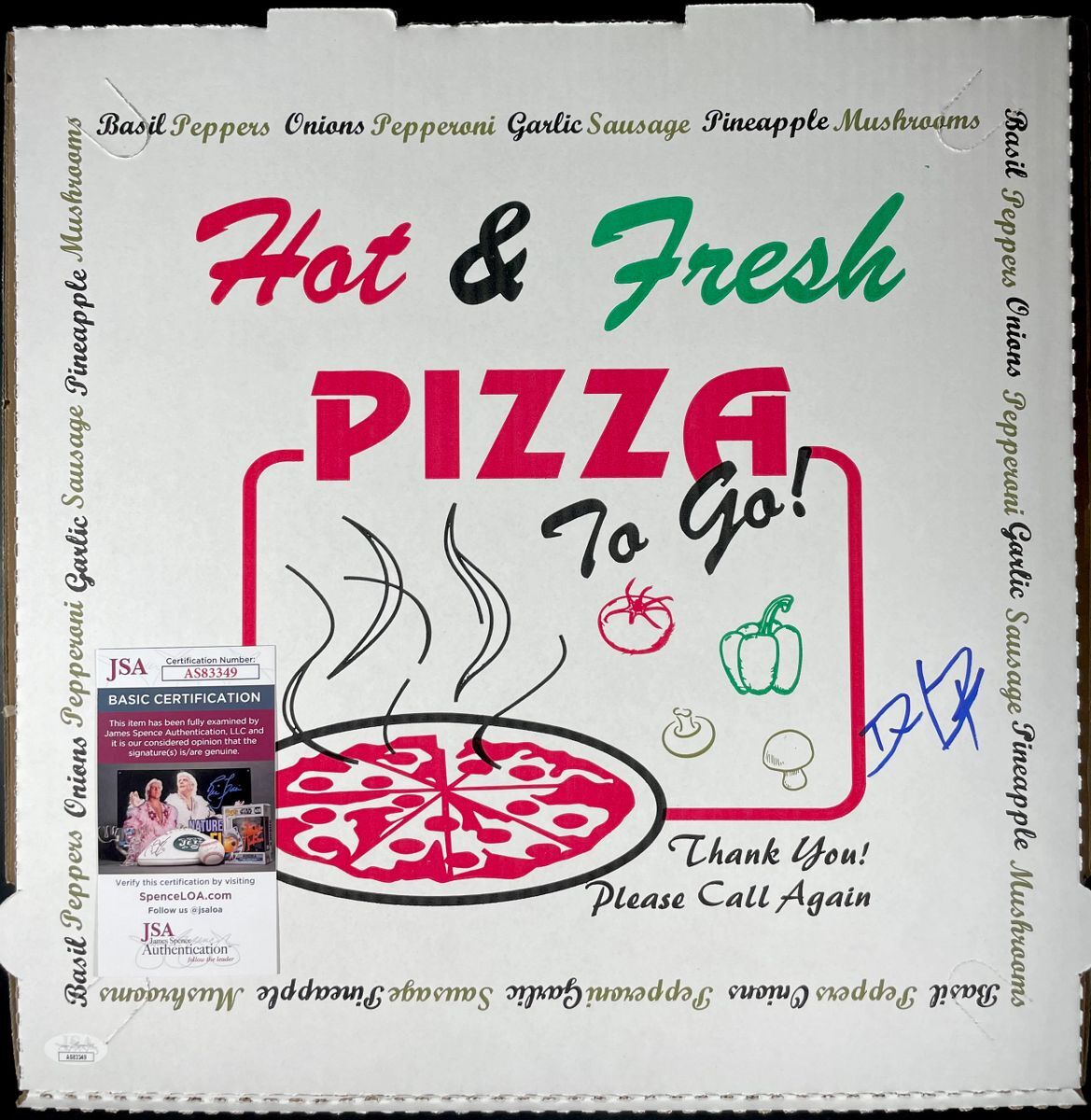 16″ Pizza box, hand signed in person by Barstool Sports and One Bite Pizza Reviews founder Dave Portnoy. This is a clean, well placed signature, signed in a flowing Blue Sharpie that really pops off the top of this 16″ Pizza Box. Item has been authenticated by James Spence Authentications, one of the most reputable third-party authentication companies in the world and includes the JSA Certificate of Authenticity Card.