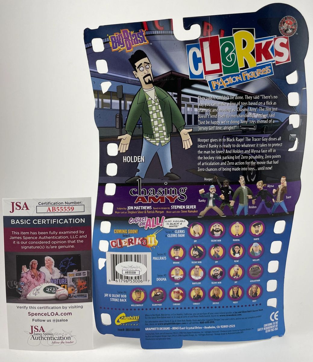 Graphitti Designs Big Blast Clerks Inaction Chasing Amy Series 5 Holden Figure, hand signed by actor Ben Affleck who played the role of Holden in Chasing Amy. This is a clean, well placed signature that really pops off of the plastic. Item has been authenticated by James Spence Authentications, and includes the JSA Certificate of Authenticity card. JSA COA# AB55559