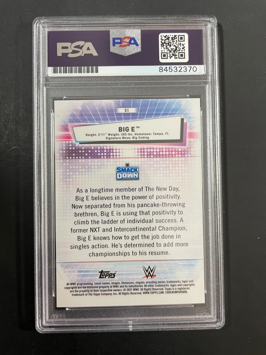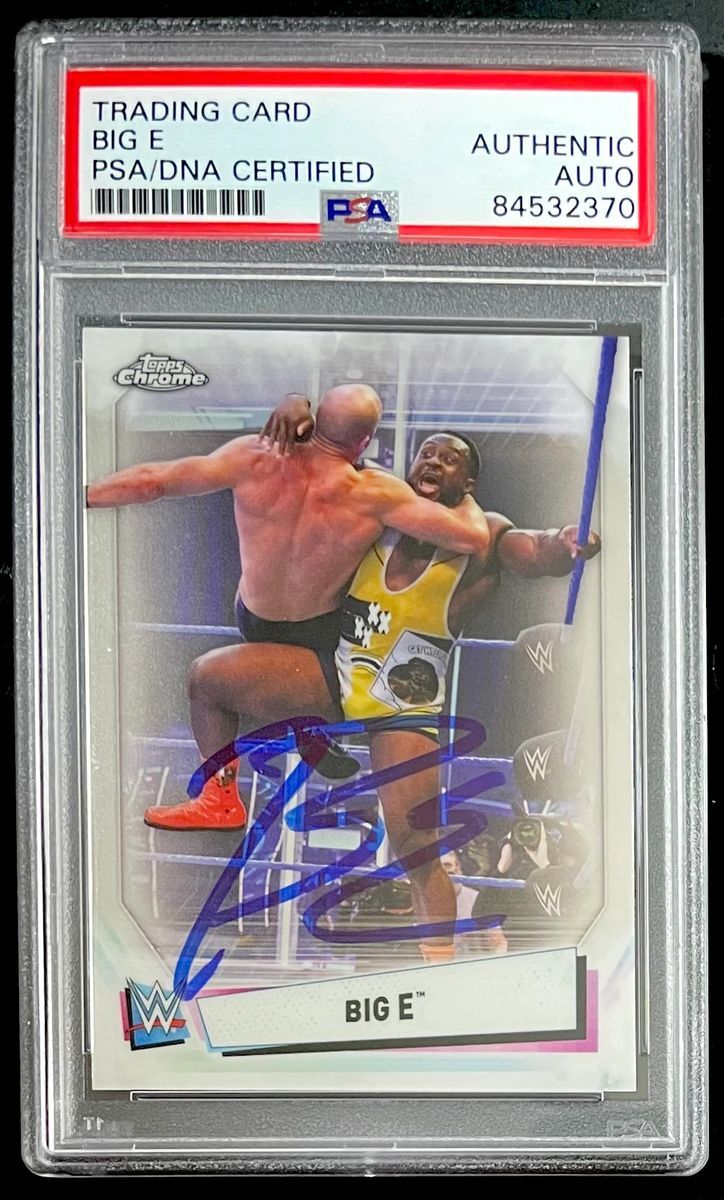 Big E 2021 Topps Chrome WWE Trading Card #51, hand signed in person by former WWE World Champion, and one third of The New Day Tag Team, Big E. This is a clean, well placed, on card signature that really pops off of this 2021 Topps Chrome WWE Trading Card. Item has been authenticated and slabbed / encapsulated by PSA/DNA, one of the most reputable third party autograph authentication companies in the world. PSA/DNA COA# 84532370