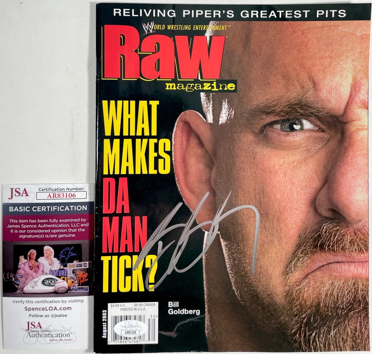 August 2003 WWE Raw Magazine, hand signed in person by WWE Hall Of Fame Superstar, Bill Goldberg. This is a clean, well placed signature, signed in a flowing Silver that really pops off of the cover of this August 2003 WWE Raw Magazine. Please be advised before purchase that this magazine is not being sold as mint. There is a crease in the upper right corner, however item still displays great as you can see in the pictures. Item has been authenticated by James Spence Authentications, one of the most reputable third party authentication companies in the world, and includes the JSA Certificate Of Authenticity card.
