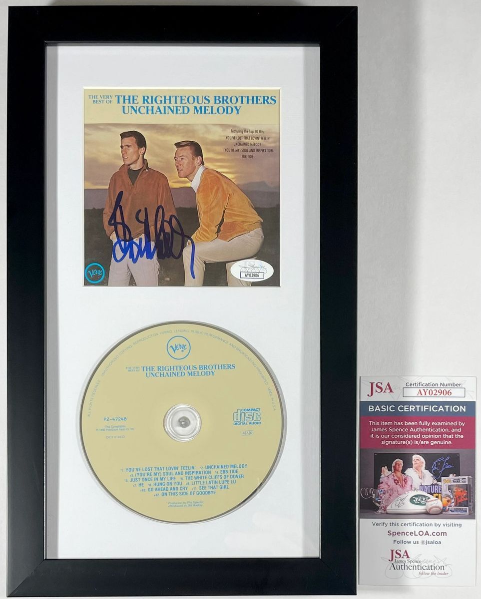 The Very Best Of The Righteous Brothers Unchained Melody CD Booklet, hand signed in person by musician Bill Medley of The Righteous Brothers. This is a clean, well paced signature, signed in a flowing Blue Sharpie that really pops off of this signed The Very Best Of The Righteous Brothers Unchained Melody CD booklet, inside of this amazing framed and matted display which includes the CD. Item has been authenticated by James Spence Authentications, one of the most reputable third-party authentication companies in the world and includes the JSA Certificate Of Authenticity card. JSA COA# AY02906