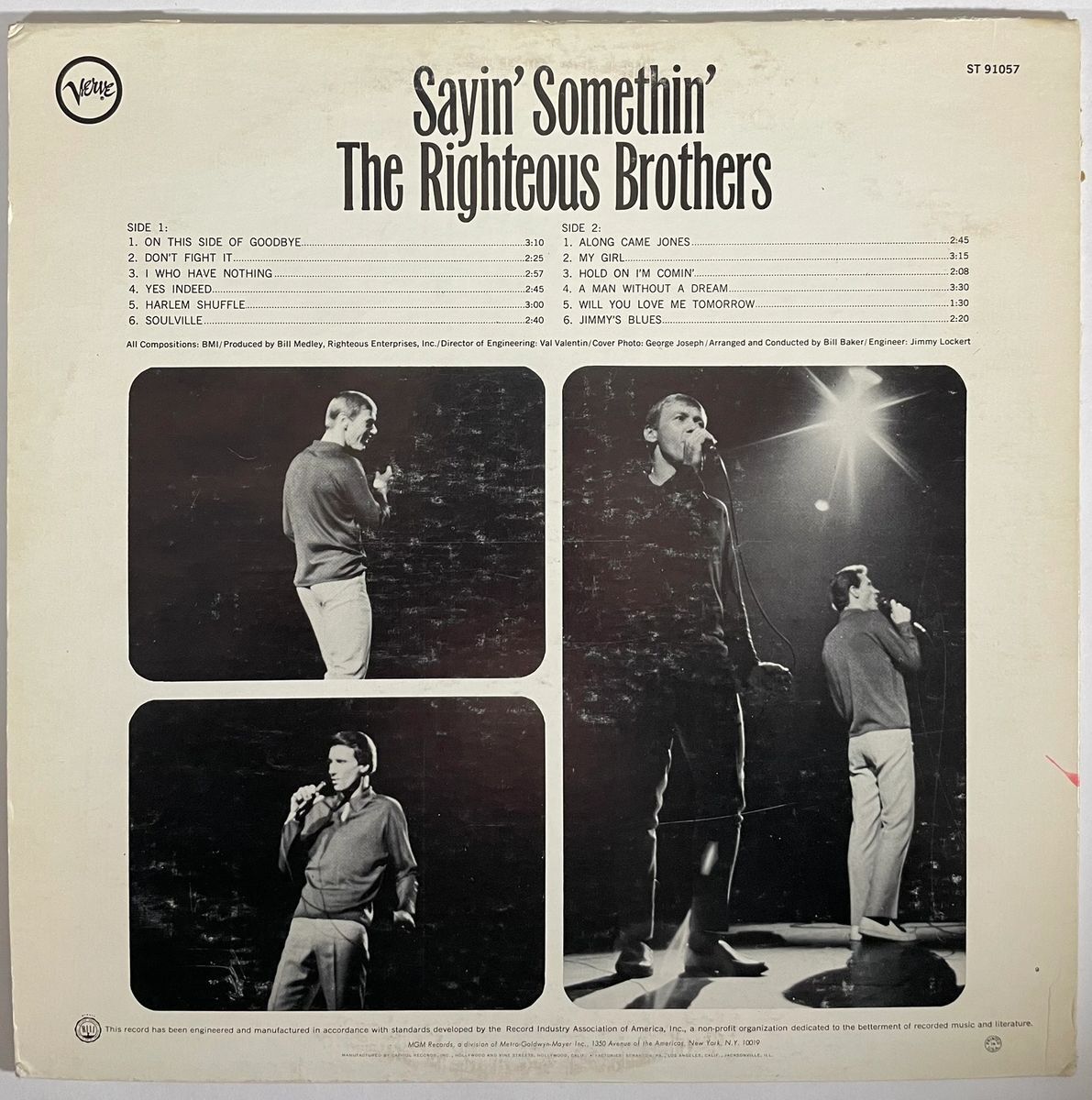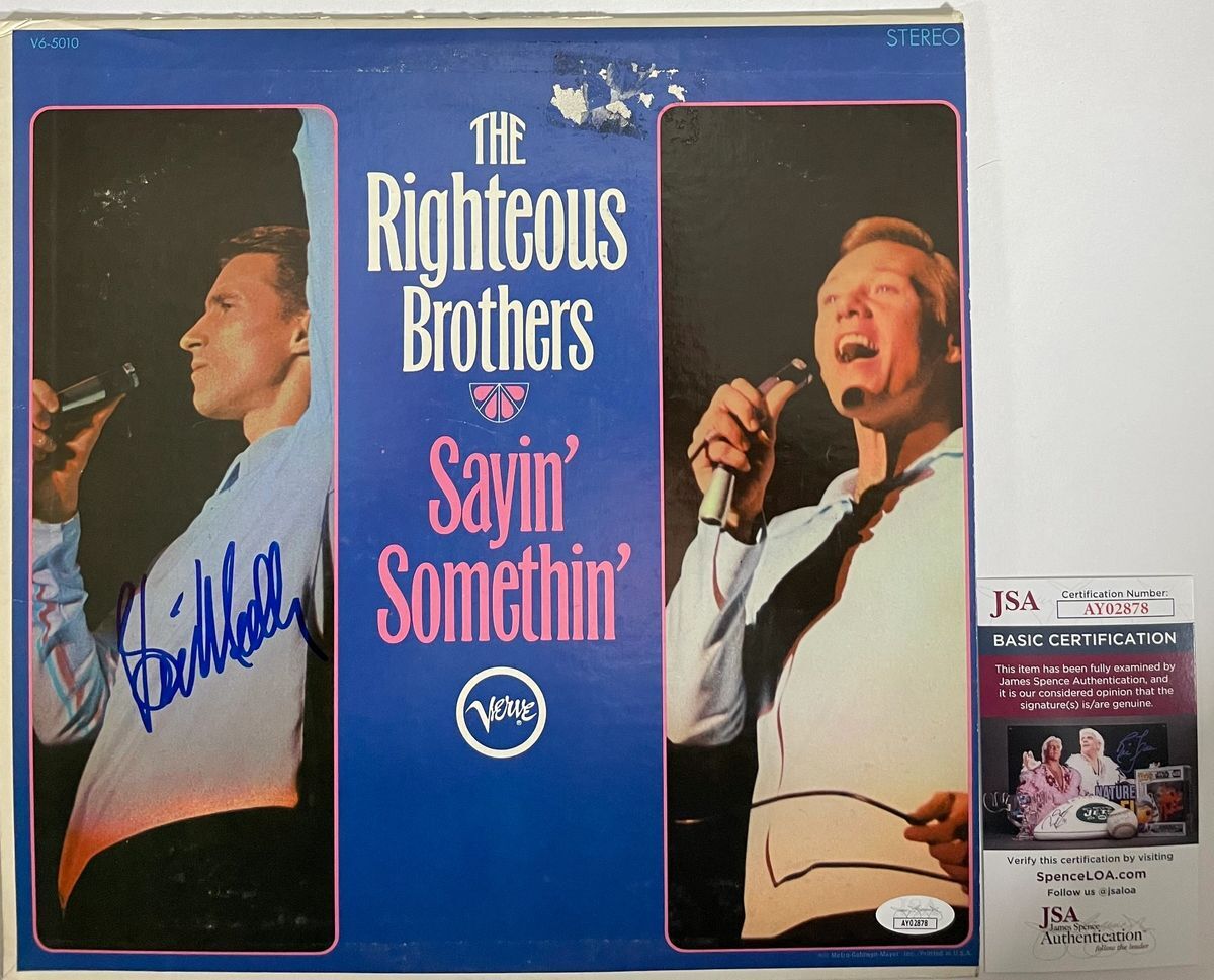 The Righteous Brothers “Sayin’ Somethin'” Vinyl Record LP with dust cover jacket, hand signed in person by legendary musician Bill Medley of The Righteous Brothers duo. This is a clean, well placed signature, signed in a flowing Blue Sharpie that really jumps off the cover of this The Righteous Brothers “Sayin’ Somethin'” Vinyl record. Please be advised before purchasing there is some damage to the dust cover jacket near the top of the front to the right of the “The” in The Righteous Brothers. Vinyl still displays great as you can see in the photos. Item has been authenticated by James Spence Authentications, one of the most reputable third party authentication companies in the world, and includes the JSA Certificate of Authenticity card. JSA COA# AY02878