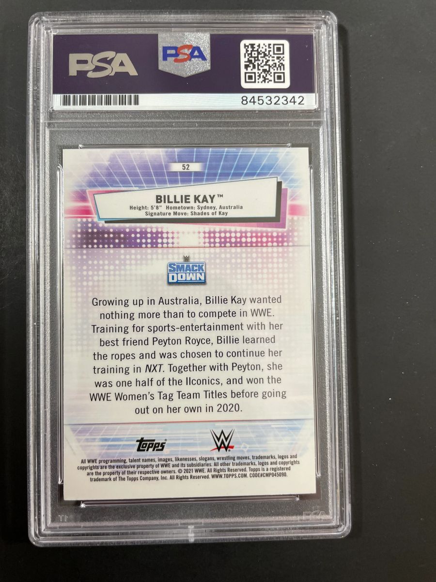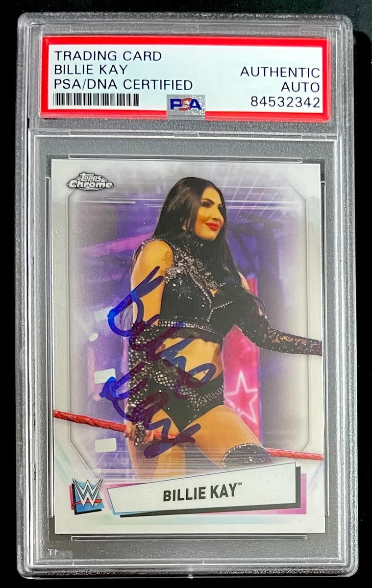 Billie Kay 2021 Topps Chrome WWE Trading Card #52, hand signed in person by former WWE Superstar, and one half of former WWE Tag Team Champions The IIconics, the lovely Billie Kay. After leaving WWE, Billie and her tag team partner Peyton Royce competed in the TNA IMPACT Wrestling Knockouts Division as The IInspiration Tag Team. This is a clean, well placed, on card signature that really pops off of this 2021 Topps Chrome WWE Trading Card. Item has been authenticated and slabbed / encapsulated by PSA/DNA, one of the most reputable third party autograph authentication companies in the world. PSA/DNA COA# 84532342