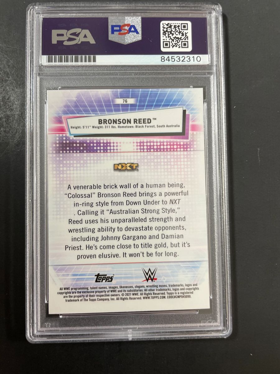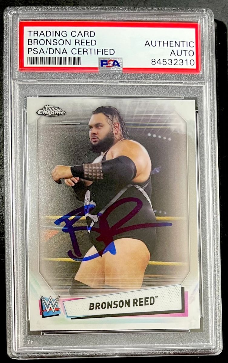 Bronson Reed 2021 Topps Chrome WWE Trading Card #76, hand signed in person by WWE Superstar, “Big” Bronson Reed. This is a clean, well placed on card signature, that really pops off of this 2021 Topps Chrome WWE Trading Card. Item has been authenticated and slabbed / encapsulated by PSA/DNA. PSA/DNA COA# 84532310