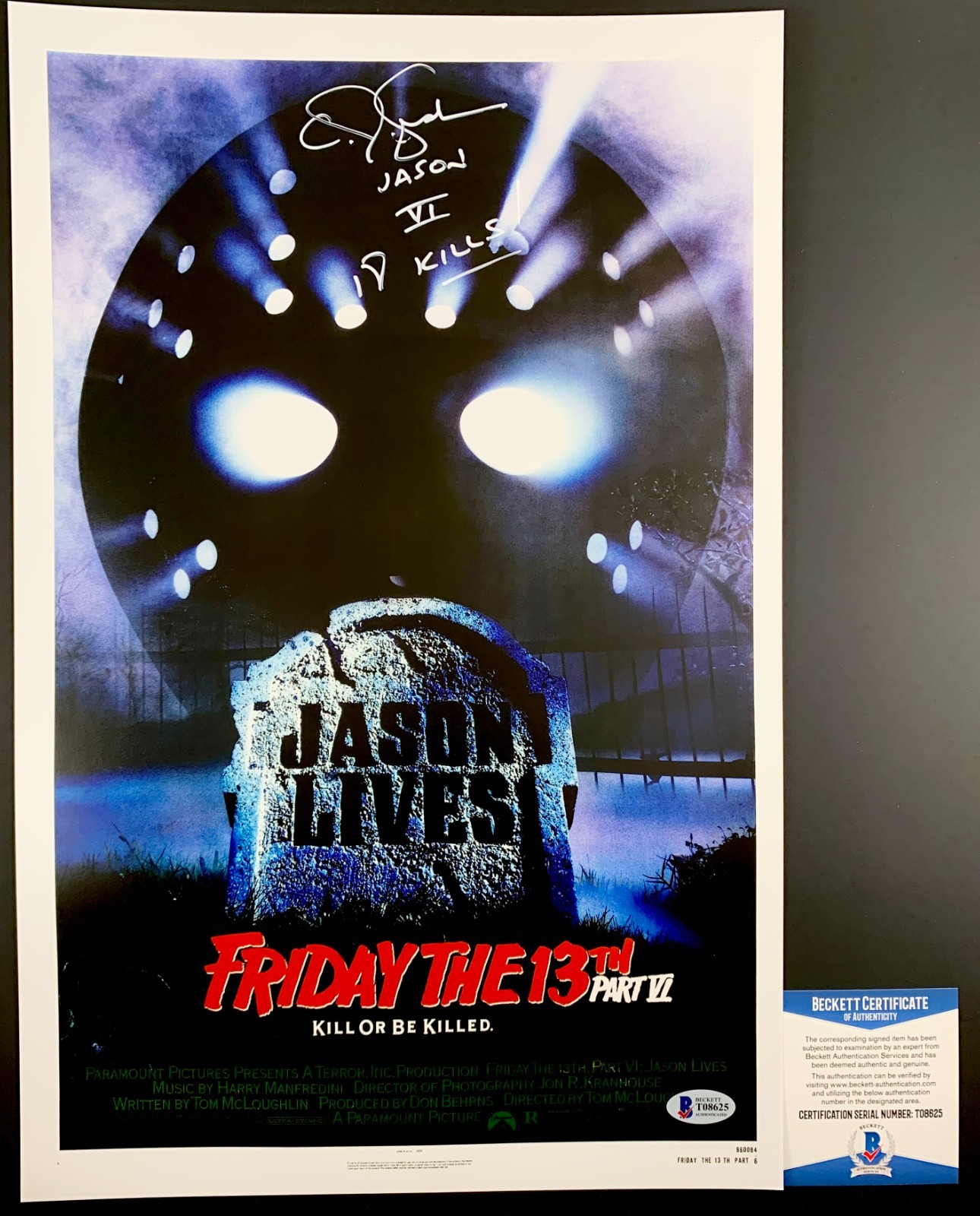Professionally printed Friday The 13th Part VI: Jason Lives 11×17 Movie Poster, hand signed in person by actor C.J. Graham who played the role of Jason Voorhees in the 1986 Horror film, Friday The 13th Part VI: Jason Lives. This is a clean, well placed signature, with character name “Jason VI” and “18 Kills” inscription, signed in a flowing White 2MM Molotow Paint Pen that really pops off of this crisp, professionally printed Friday The 13th Part VI: Jason Lives 11×17 Movie Poster. A clear plastic 11×17 toploader is included with purchase to safely ship the poster inside of. Item has been authenticated by Beckett Authentication Services, one of the most reputable third-party authentication companies in the world, and includes the Beckett Certificate of Authenticity Card.
