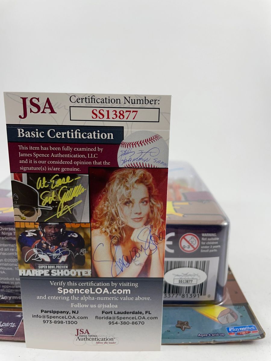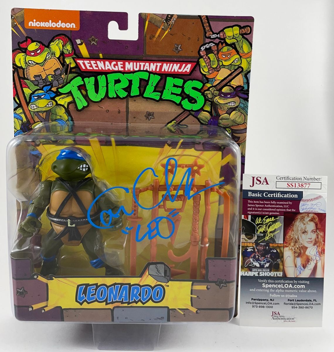 Teenage Mutant Ninja Turtles Leonardo Playmates Figure, hand signed by voice actor Cam Clarke who is known for his work as the voice of the original Leonardo. This is a clean, well placed signature, with character name “Leo” signed in a flowing Blue 2 MM Decco paint pen. Item has been authenticated by James Spence Authentications, and includes the JSA Certificate of Authenticity card.