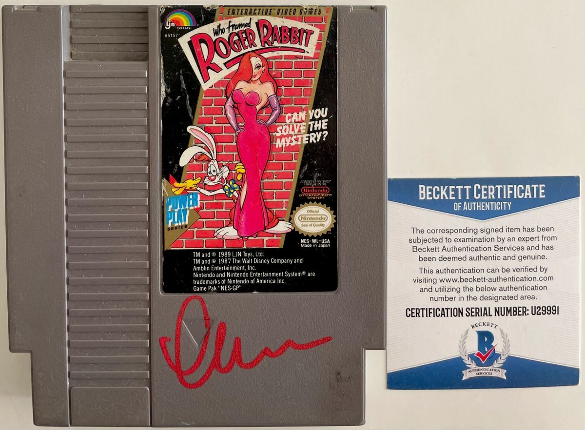 Who Framed Roger Rabbit Original Nintendo (NES) video game cartridge, hand signed in person by actor Charles Fleischer who was the voice of Roger Rabbit in Who Framed Roger Rabbit. This is a clean, well placed signature, signed in a flowing Red 2MM Molotow Paint Pen that really pops off of the front of this Who Framed Roger Rabbit Original Nintendo (NES) video game cartridge. Please see photos before purchasing as there are some minor flaws to the sticker. Cartridge still displays great as you can see in the photos. Item has been authenticated by Beckett Authentication Services, one of the most reputable third party authentication companies in the world, and includes the Beckett Certificate of Authenticity Card.
