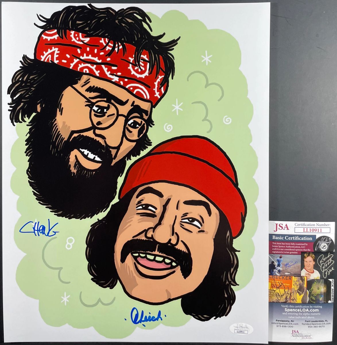 Professionally printed Cheech and Chong’s Up In Smoke11x14 photo, dual signed by Hollywood Icons, Cheech Marin and Tommy Chong. This is two clean, well placed signatures that really pop off of this crisp, professionally printed 11×14 photo. Item has been authenticated by James Spence Authentications, and includes the JSA Certificate of Authenticity card. JSA COA# LL10911
