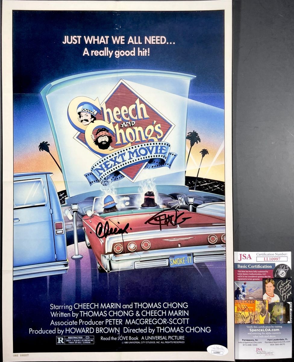 Professionally printed Cheech and Chong’s Next Movie 11×17 Movie Poster, hand signed in person by Hollywood Icons, Cheech Marin and Tommy Chong. This is two clean, well placed signatures, signed in a matching flowing Black Sharpie that really pops off of this crisp, professionally printed Cheech & Chong’s Next Movie 11×17 Movie Poster. A clear plastic 11×17 toploader is included with purchase to safely ship the poster inside of, unless buyer specifies to have the poster shipped rolled in a tube. Item has been authenticated by James Spence Authentications, one of the most reputable third-party authentication companies in the world and includes the JSA Certificate of Authenticity card.