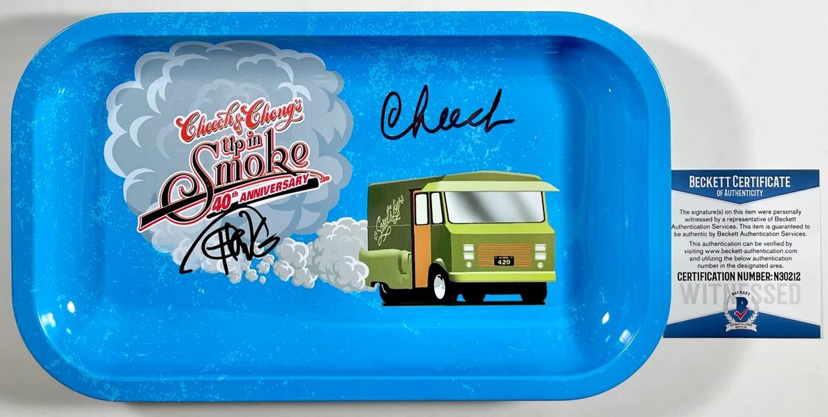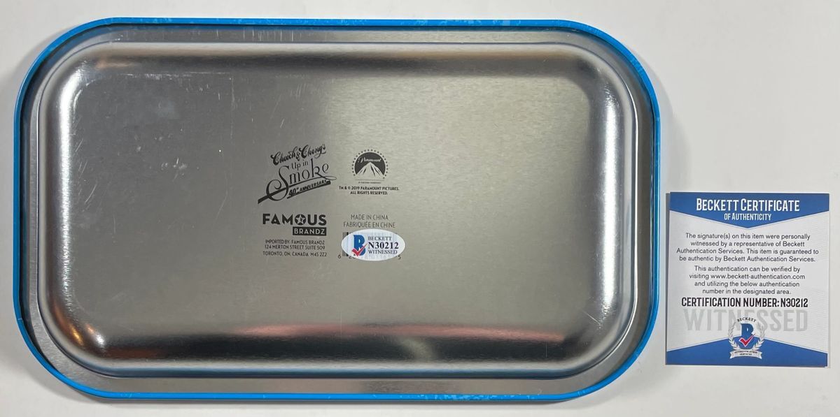 Cheech and Chong Up In Smoke 40th Anniversary Blue Rolling Tray, hand signed in person by pop culture icons Cheech Marin and Tommy Chong. This is two clean, well placed signatures that really pop off of this unique autographed collectible. Item has been authenticated by Beckett Authentication Services, one of the most reputable third party authentication companies in the world. Beckett Certificate Of Authenticity card is included. BAS COA# N30212