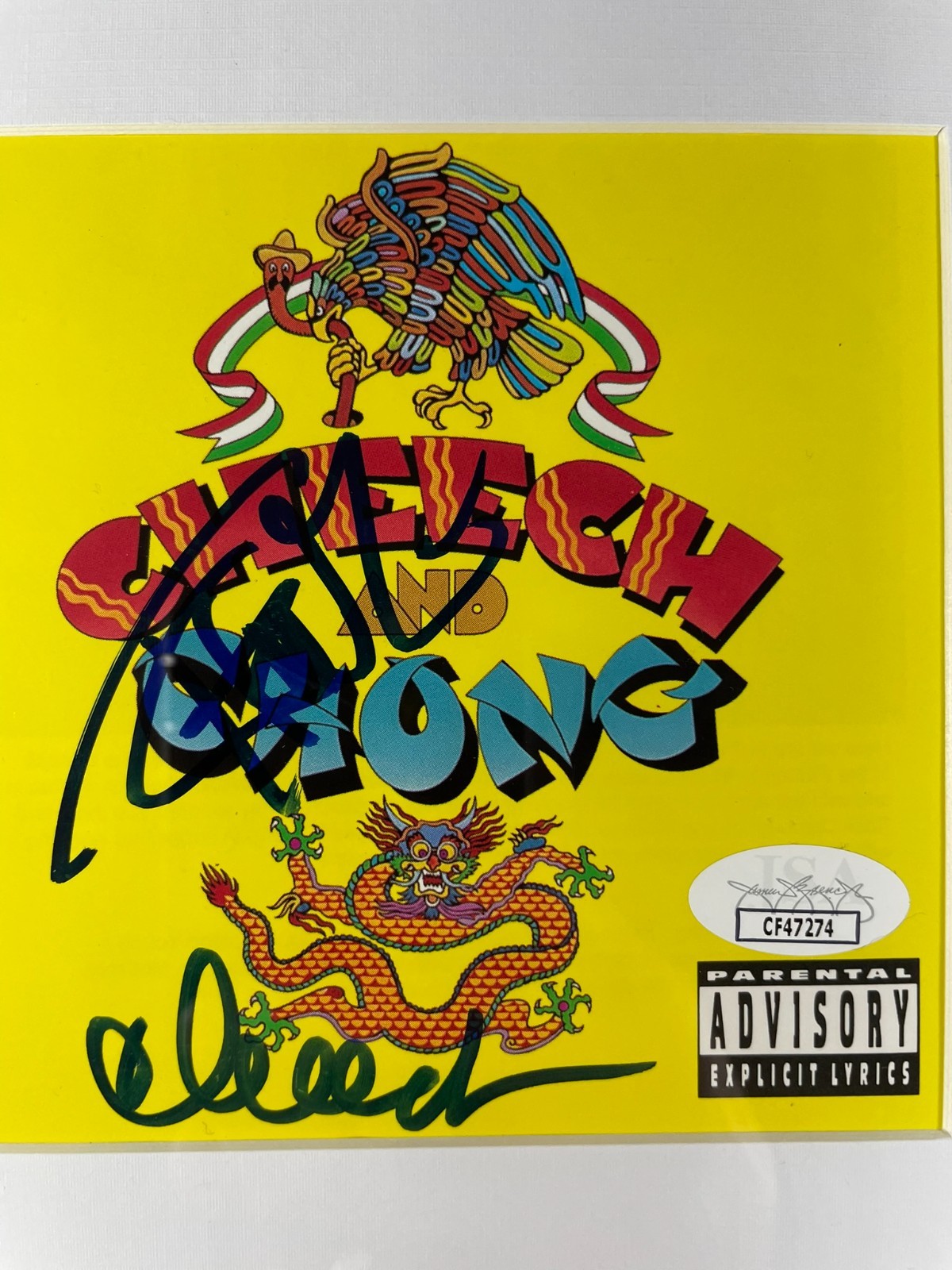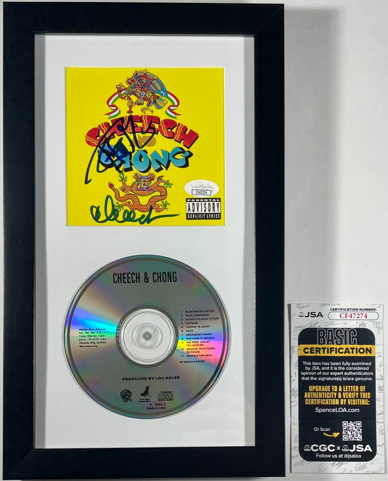 Cheech & Chong CD and signed CD Booklet, hand signed in person by Pop Culture Icons Cheech Marin and Tommy Chong. This is two clean, well paced signatures, signed in a matching, flowing, Blue Sharpie that really pops off of this Cheech & Chong CD Booklet, inside of this amazing framed and matted display which includes the CD. Item has been authenticated by James Spence Authentication, one of the most reputable third-party authentication companies in the world, and includes the JSA Certificate Of Authenticity card.