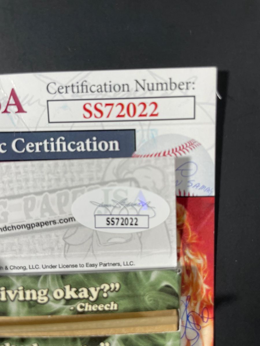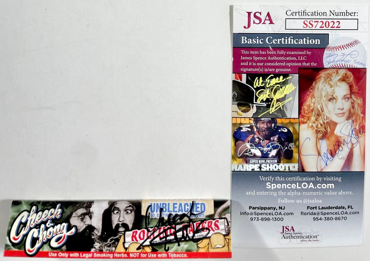 Cheech and Chong Extra Large Rolling Papers, hand signed in person by pop culture icons Cheech Marin and Tommy Chong. This is two clean, well placed signatures that really pop off of this unique autographed collectible. Item has been authenticated by James Spence Authentications, one of the most reputable third party authentication companies in the world. JSA Certificate Of Authenticity card is included. JSA COA# SS72022