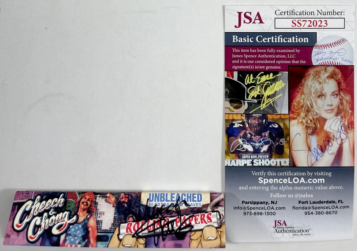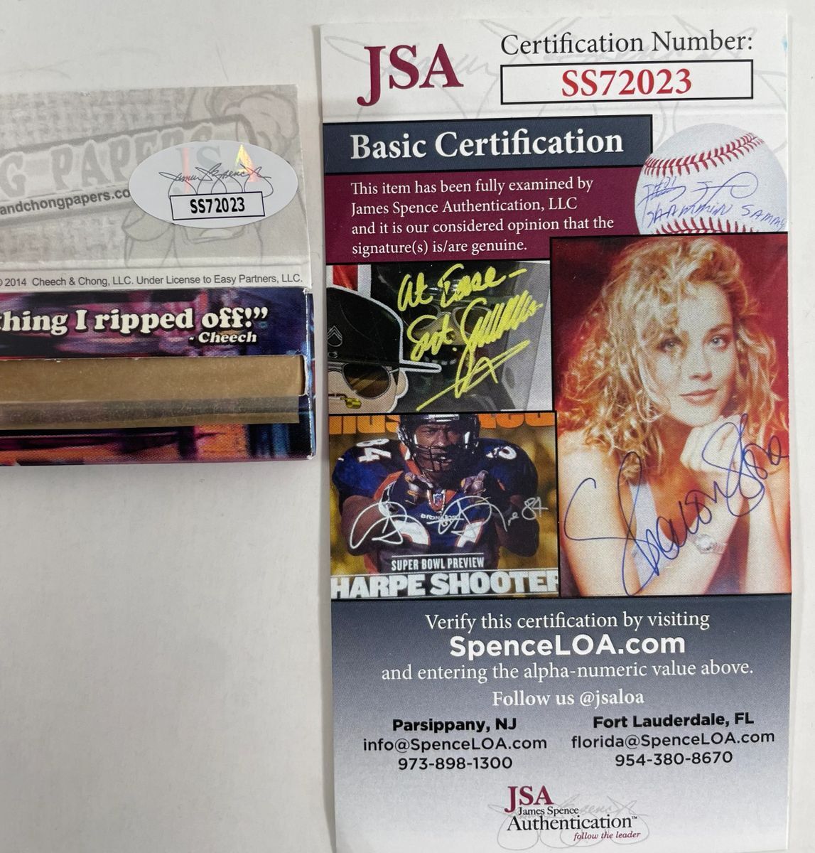 Cheech and Chong Extra Large Rolling Papers, hand signed in person by pop culture icons Cheech Marin and Tommy Chong. This is two clean, well placed signatures that really pop off of this unique autographed collectible. Item has been authenticated by James Spence Authentications, one of the most reputable third party authentication companies in the world, and includes the JSA Certificate Of Authenticity card.