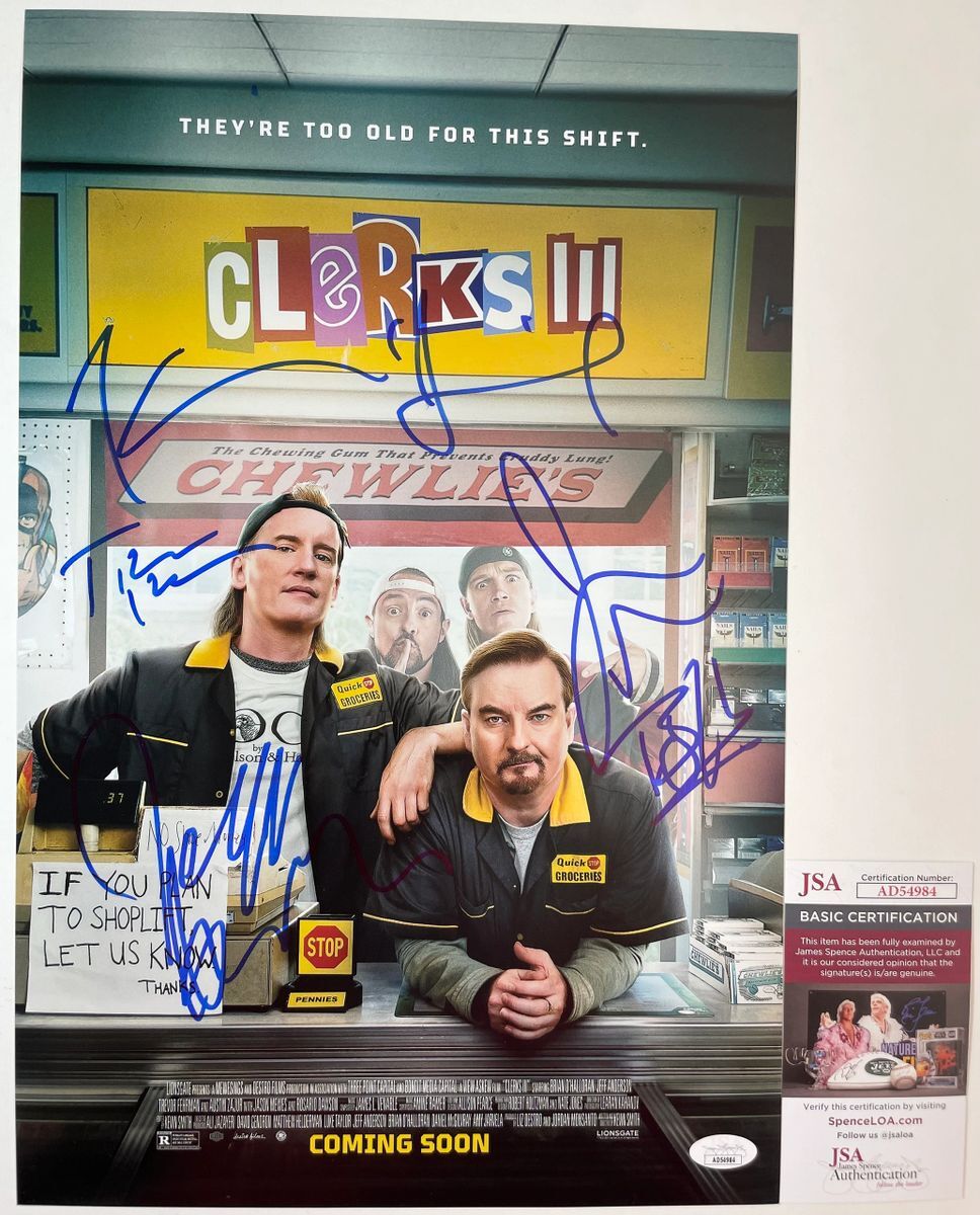 Professionally printed Clerks III 11×17 movie poster, cast signed by five members of the star studded cast. Not only does Kevin Smith play the role of Silent Bob, he also wrote and directed Clerks 1, 2, and 3 as well as Mallrats, Chasing Amy, Jay and Silent Bob Strike Back, Dogma, and many other classic films of the past few decades. This is five clean, well placed signatures, that really pop off of this crisp, professionally printed Clerks III 11×17 movie poster. Poster was signed by the following six celebrities. 1. Kevin Smith (Writer, Director, Silent Bob) 2. Jason Mewes (Jay) 3. Brian O’Halloran (Dante) 4. Jeff Anderson (Randal) 5. Trevor Fehrman (Elias) Item has been authenticated by James Spence Authentications, and includes the JSA Certificate of Authenticity Card. JSA COA# AD54984