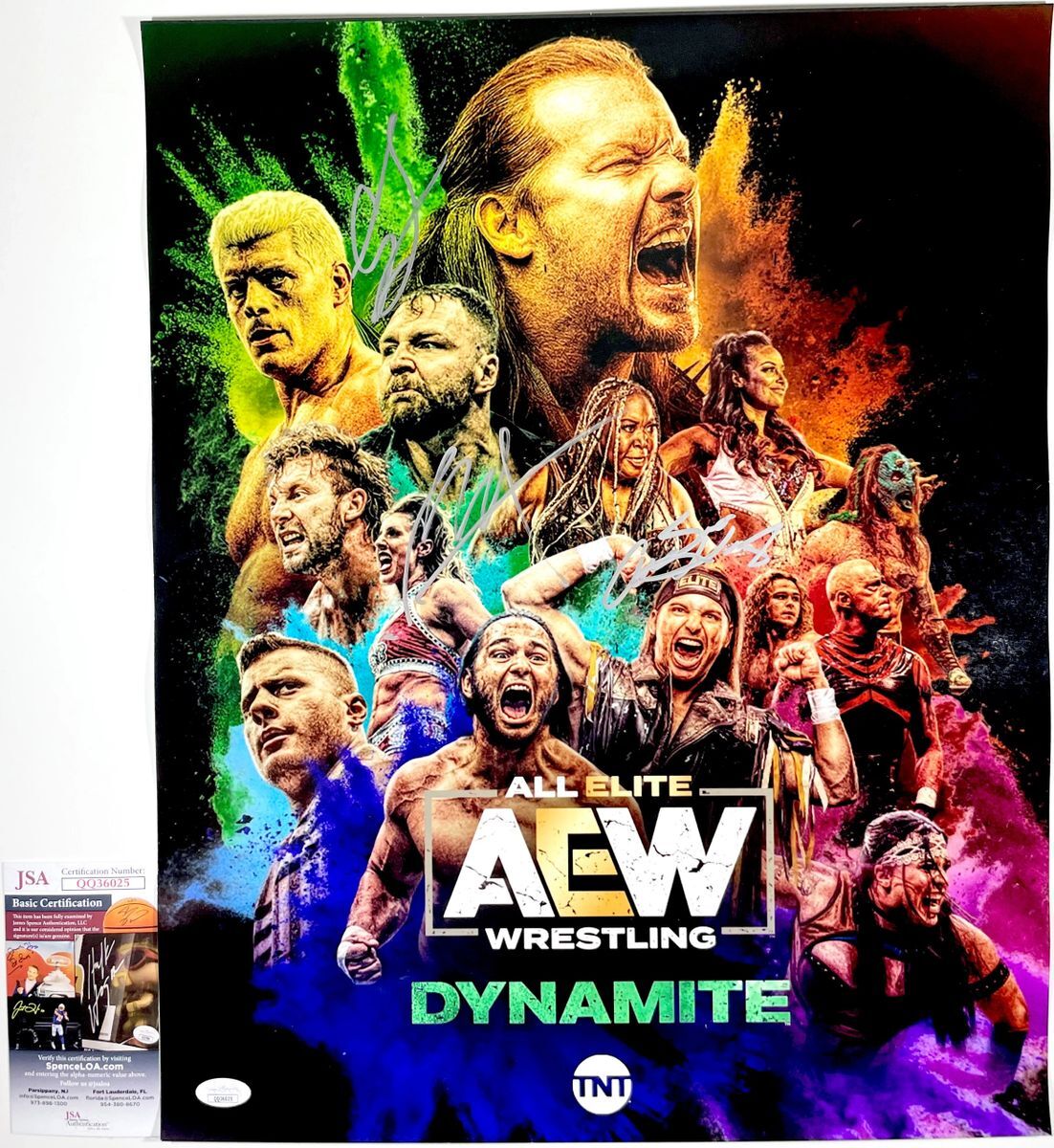 Professionally printed AEW Dynamite 16×20 photo, hand signed in person by three past and present AEW wrestlers, including former AEW World Champion and Blackpool Combat Club member Jon Moxley, as well as former AEW Women’s Wrestler Awesome Kong who previously competed in the WWE under the ring name Kharma. And last but not least former AEW EVP, currently signed to WWE, “The American Nightmare” Cody Rhodes. This is three clean, well placed signatures that really pop off of this crisp, professionally printed AEW Dynamite 16×20 photo. Item has been authenticated by James Spence Authentications, one of the most reputable third party authentication companies in the world. The JSA Certificate Of Authenticity card is included.