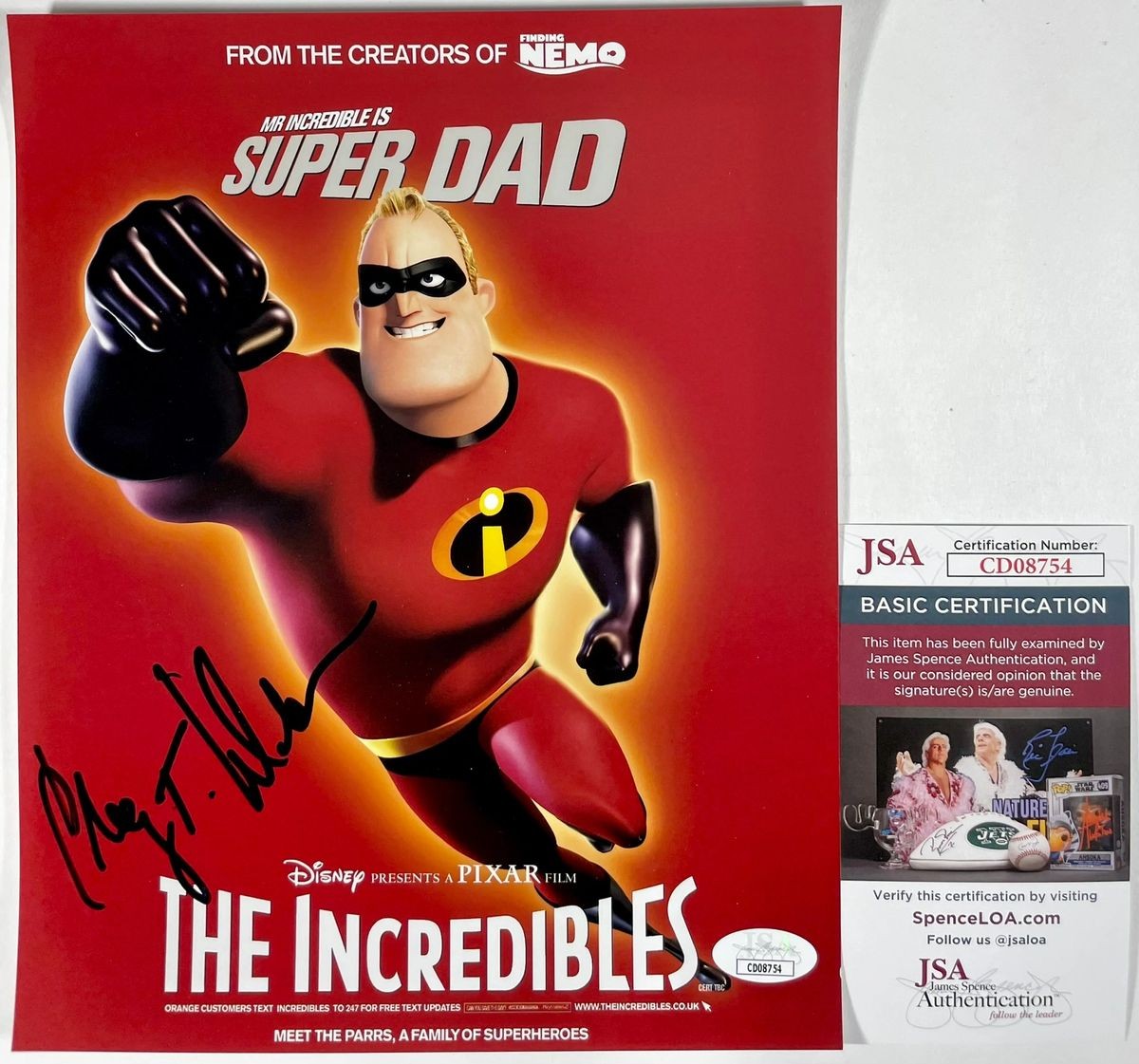 Professionally printed Disney PIXAR The Incredibles 8×10 Mini Movie Poster Photo, hand signed in person by actor Craig T. Nelson who is credited as the voice of Mr. Incredible in the hit Disney PIXAR films, The Incredibles. This is a clean, well placed signature, signed in a flowing Black Sharpie that really pops off of this crisp, professionally printed Disney PIXAR The Incredibles 8×10 Mini Movie Poster Photo. A clear plastic 8×10 toploader is included with purchase to safely ship the photo inside of. Item has been authenticated by James Spence Authentications, one of the most reputable third-party authentication companies in the world and includes the JSA Certificate Of Authenticity card.