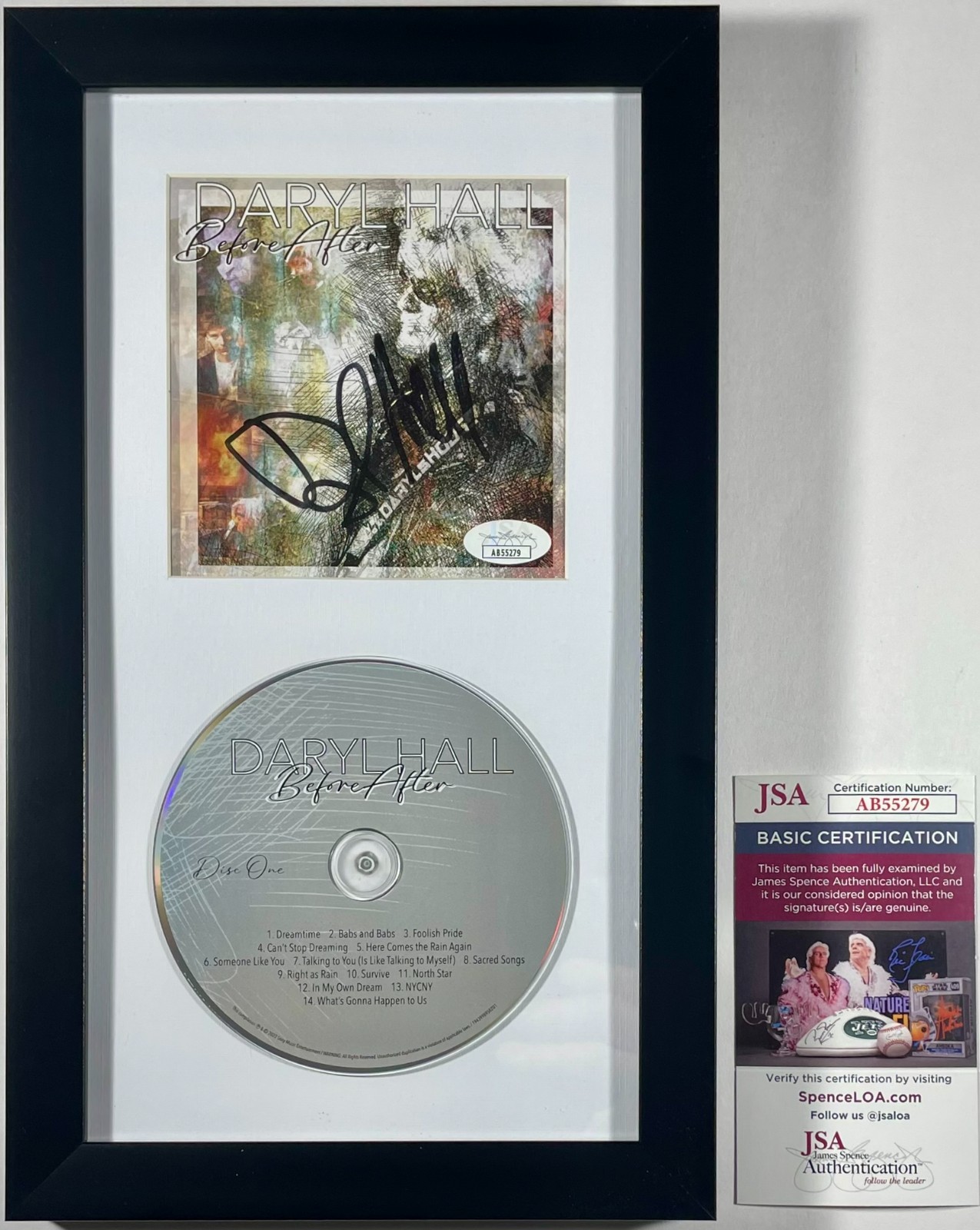 Daryl Hall Before After CD and signed CD Booklet, hand signed in person by musician Daryl Hall of the popular group Hall & Oates.  This is a clean, well paced signature, signed in a flowing Black Sharpie that really pops off of this Daryl Hall Before After CD Booklet, inside of this amazing framed and matted display which includes the CD.  Item has been authenticated by James Spence Authentication, one of the most reputable third-party authentication companies in the world, and includes the JSA Certificate Of Authenticity card.