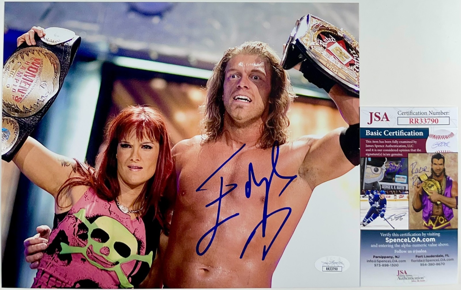 Professionally printed 8×10 Photo, hand signed in person by Hall Of Fame WWE Superstar, The “Rated R Superstar” Edge. In 2025 Edge wrestles for Tony Khan’s All Elite Wrestling (AEW) under his shoot name Adam Copeland aka Cope. This is a clean, well placed signature, signed in a flowing Blue Sharpie that really pops off of this crisp, professionally printed 8×10 Photo. A clear plastic 8×10 toploader is included with purchase to safely ship the photo inside of. Item has been authenticated by James Spence Authentication, one of the most reputable third-party authentication companies in the world, and includes the JSA Certificate Of Authenticity card.