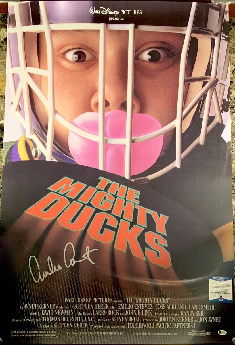 Walt Disney’s The Mighty Ducks 27×40 full size poster, hand signed in person by star of the popular trilogy, Emilio Estevez who played the role of Coach Gordon Bombay. This is a clean, well placed signature that really pops off of this The Mighty Ducks 27×40 full size movie poster. Item was witnessed being signed by Beckett Authentication Services, one of the most reputable third party authentication companies in the world, and includes the Beckett Witness Certificate of Authenticity Card. BAS COA# WC61151