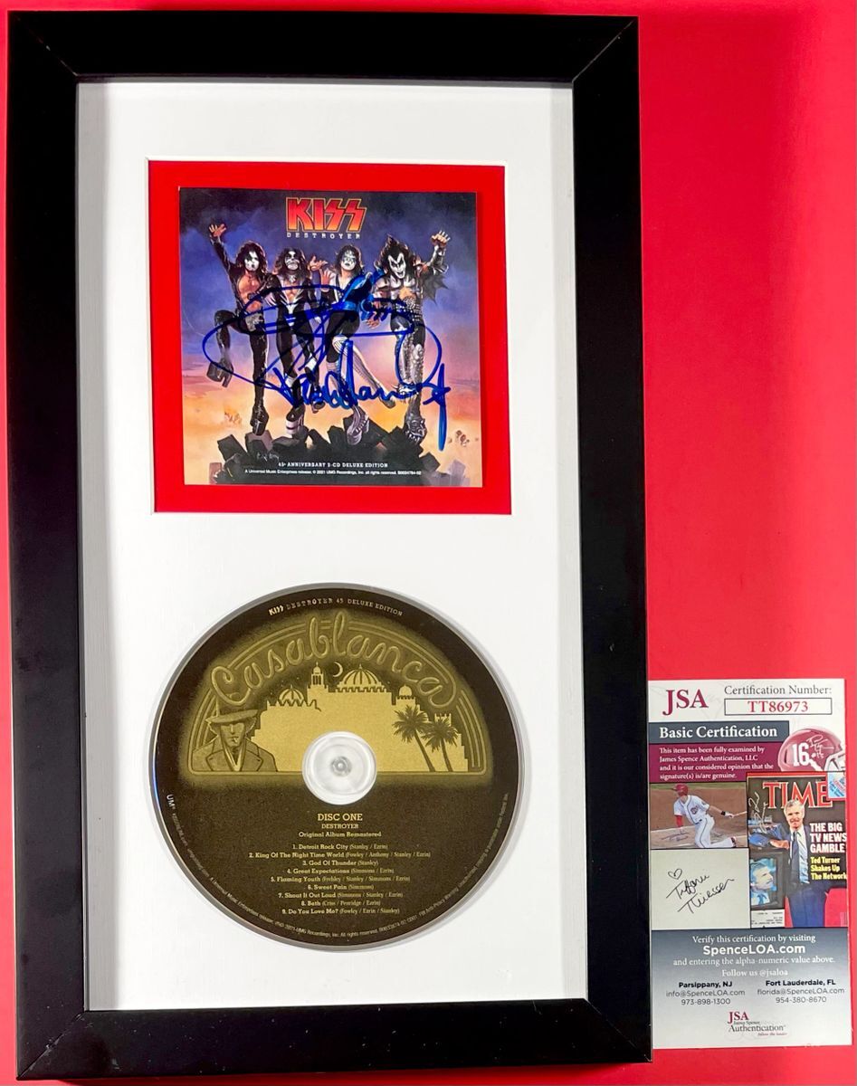 KISS 45th Anniversary Destroyer CD and 3.75×3.75 Art Card, hand signed by Rock and Roll legends Gene Simmons and Paul Stanley of KISS. This is two clean, perfectly paced signatures, signed in a flowing Blue Sharpie that really pop off of this signed KISS Destroyer Art Card inside of this amazing framed and matted display. Item has been authenticated by James Spence Authentications, one of the most reputable third-party authentication company in the world and includes the JSA Certificate Of Authenticity card.