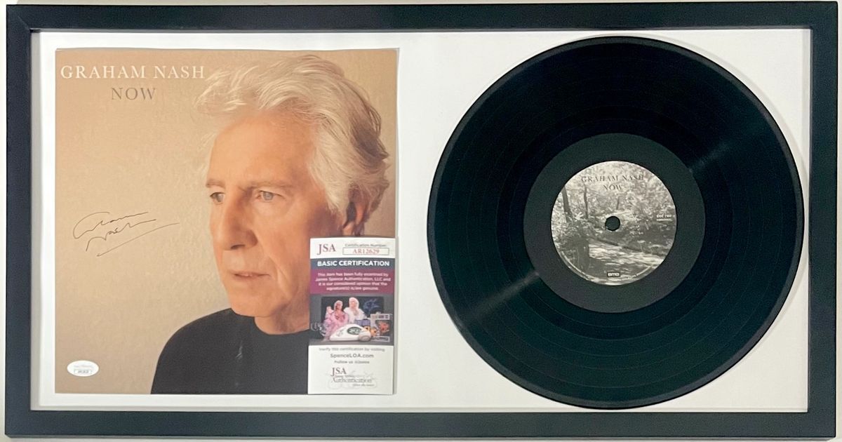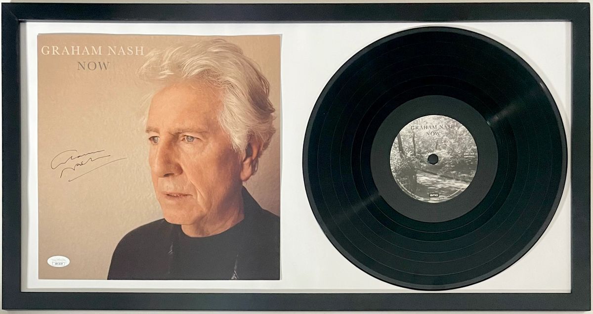 Graham Nash Now 12″ Vinyl Record with 11×11 Graham Nash Now Art Card, hand signed in person by legendary musician Graham Nash. This is a clean, perfectly placed signature, signed in a flowing Black that really pops off of this Graham Nash Now 11×11 Art Card with 12″ Vinyl Record inside of this amazing framed display. Item has been authenticated by James Spence Authentications, one of the most reputable third-party authentication companies in the world and includes the JSA Certificate Of Authenticity card.