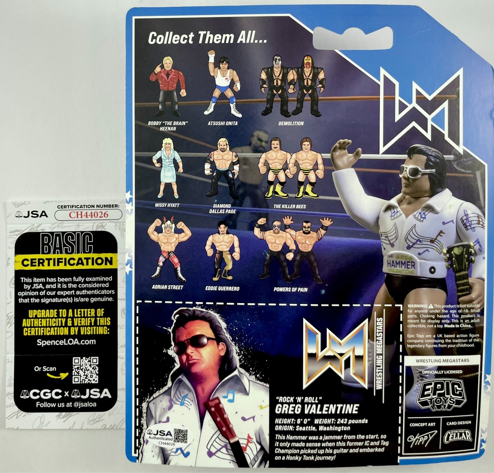 “Rock N’ Roll” Greg Valentine Epic Toys Wrestling Megastars Figure, hand signed in person by WWE Hall Of Fame Superstar, Greg “The Hammer” Valentine who was one half of the legendary Tag Team, Rythem and Blues. This is a clean, well placed signature, signed in a flowing White 2MM Molotow Paint Pen that really pops off of the card backing. Please make note before purchasing the figure is not being sold as mint as the bubble had to be re-glued in some spots, however the figure still displays beautifully as you can see in the photos. Item has been authenticated by James Spence Authentications, one of the most reputable third-party authentication companies in the world, and includes the JSA Certificate of Authenticity card.