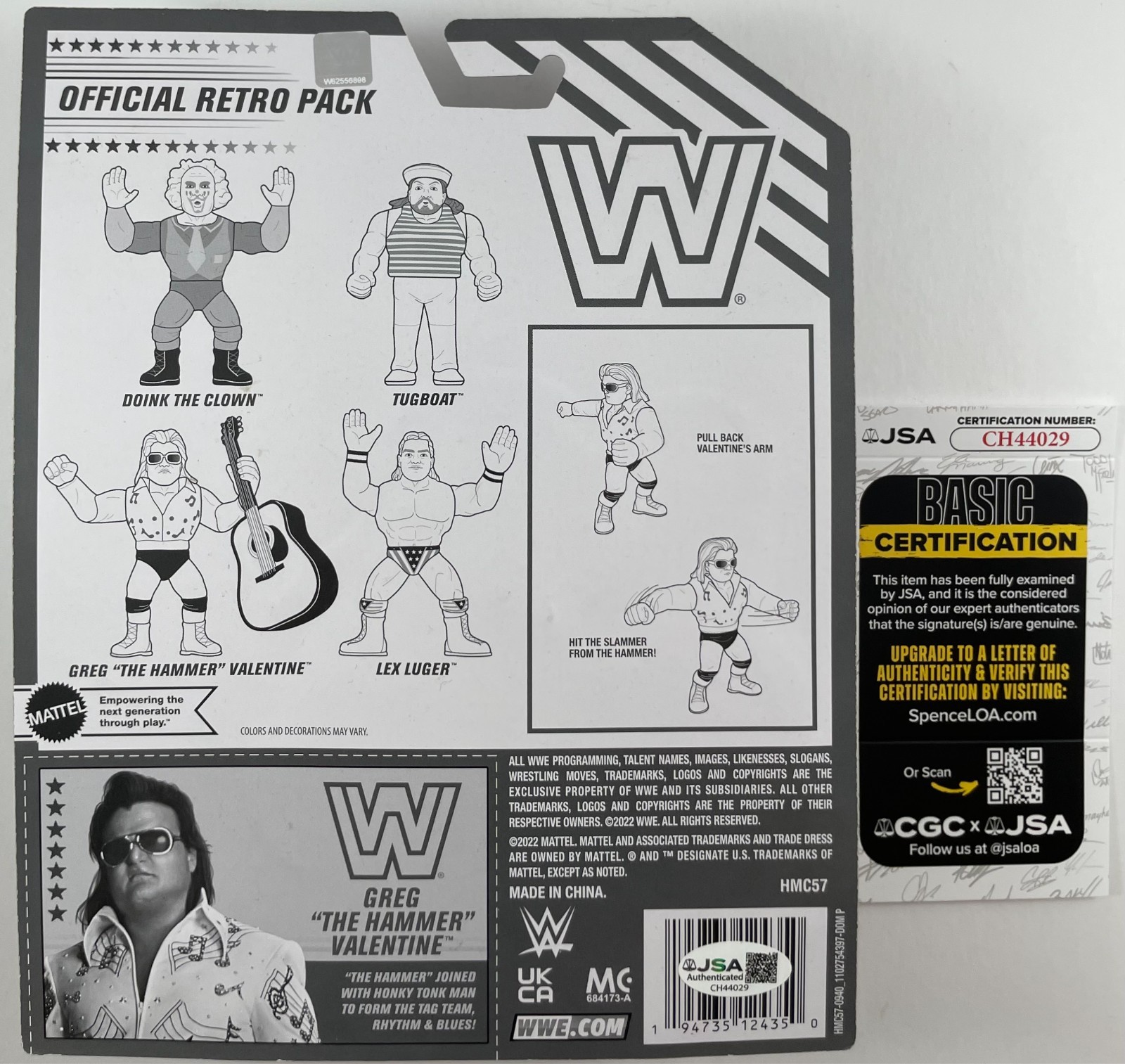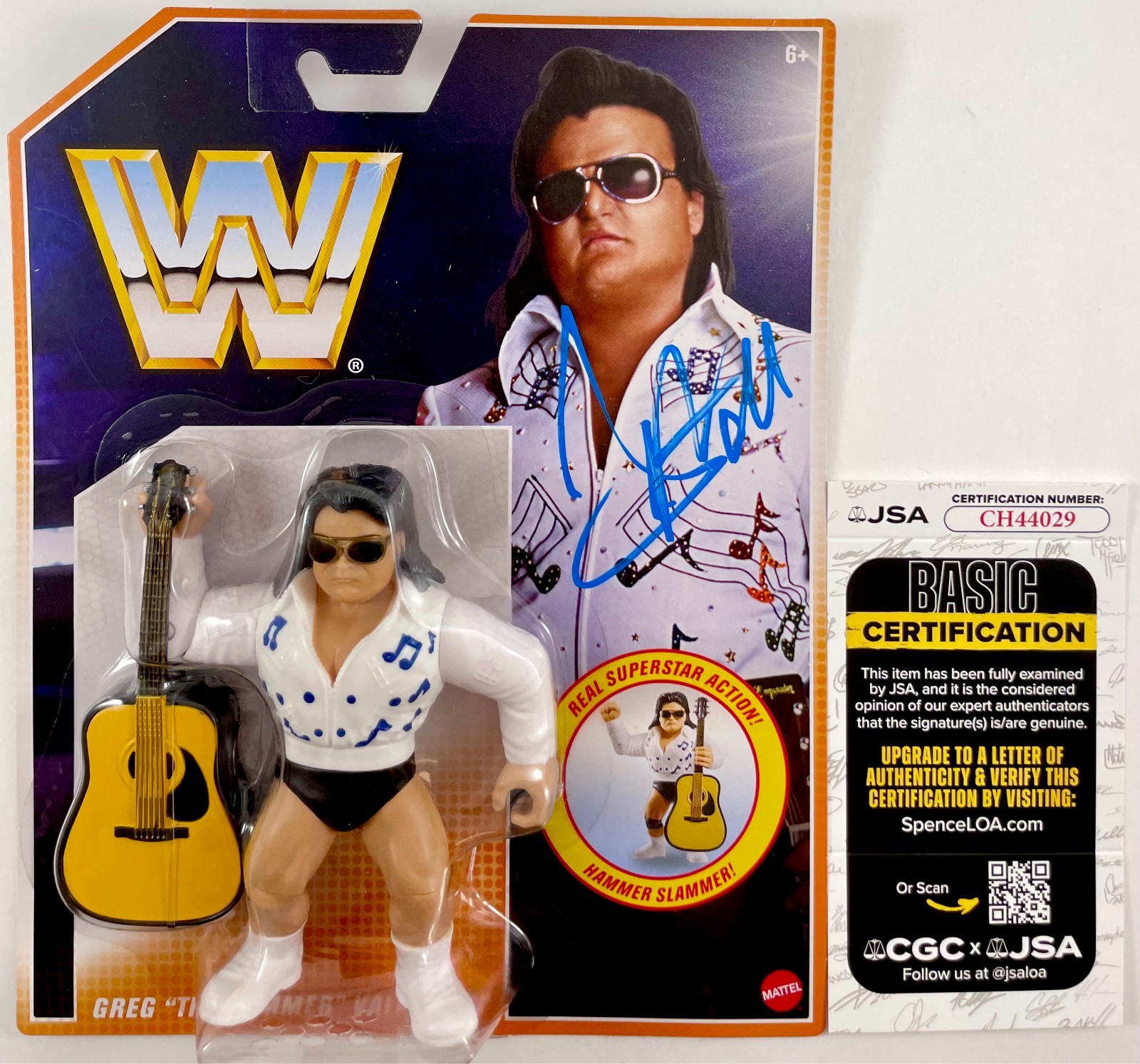 Greg “The Hammer Valentine WWE Mattel Retro Wrestling Figure by Mattel Creations, hand signed in person by WWE Hall Of Fame Superstar, Greg “The Hammer” Valentine who was one half of the legendary Tag Team, Rythem and Blues. These Mattel WWE Retro Figures are very similar to the old WWF Hasbro figures in size and appearance. This is a clean, well placed signature, signed in a flowing Blue 2MM DECCO Paint Pen that really pops off of the card backing. Item has been authenticated by James Spence Authentications, one of the most reputable third-party authentication companies in the world, and includes the JSA Certificate of Authenticity card.
