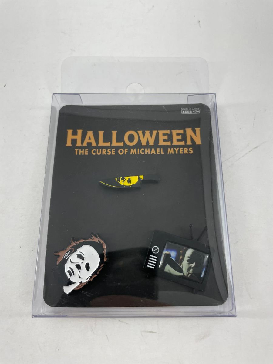 Officially Licensed Miramax Halloween The Curse Of Michael Myers Collectible 3 Pin Set Spirit Halloween. Brand new, in hand, and ready to ship to all of you Michael Myers fans out there. What you see in the photo is what you will receive.